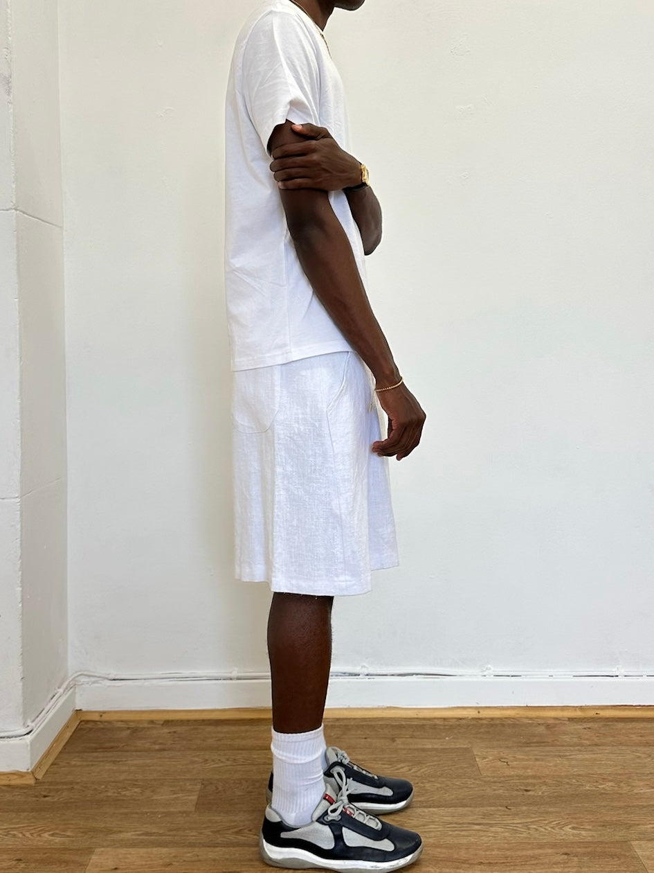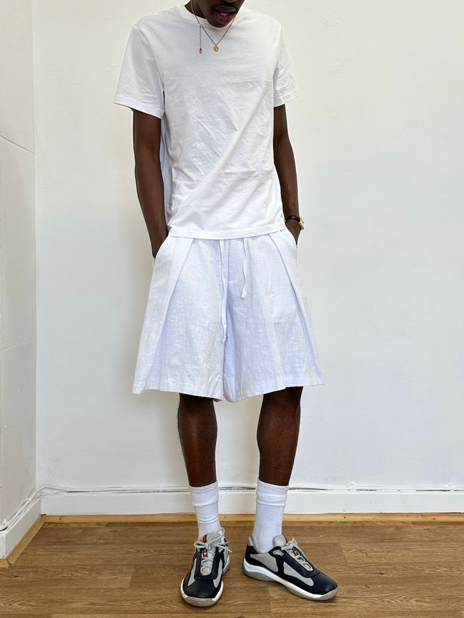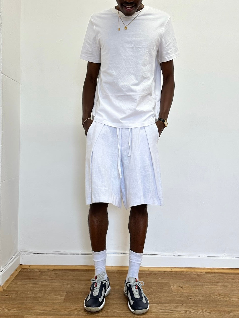 Weiße Leinenshorts im Unisex-Bermuda-Stil mit Plissee. Mit lockerer Passform und verstellbarem Kordelzug in der Taille. Hergestellt aus 100 % Leinen aus Restbeständen mit gesticktem „Made in London“-Etikett.