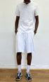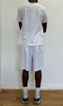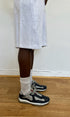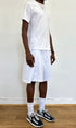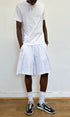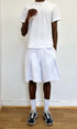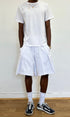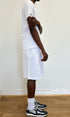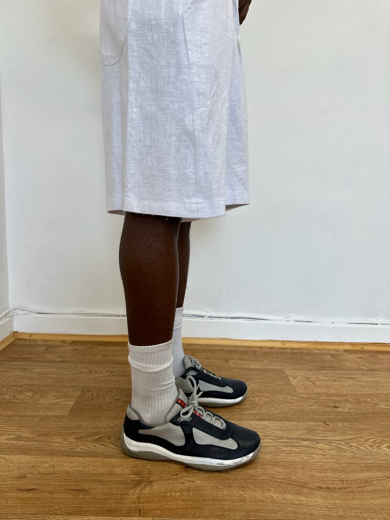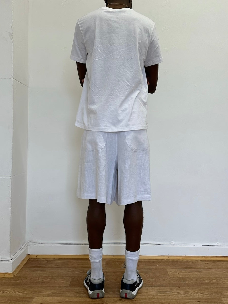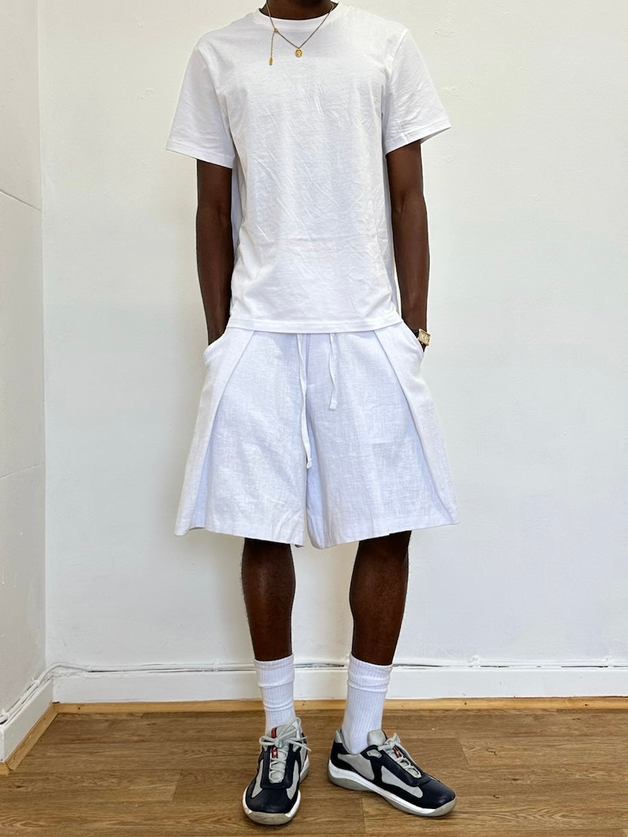 Weiße Leinenshorts im Unisex-Bermuda-Stil mit Plissee. Mit lockerer Passform und verstellbarem Kordelzug in der Taille. Hergestellt aus 100 % Leinen aus Restbeständen mit gesticktem „Made in London“-Etikett.