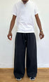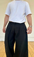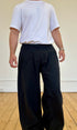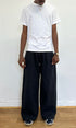 Jonathon is a UK 32/34, 5ft 6 (171cm). He wears a size L 29/30 in the parker trouser - white & black linen (first model).
