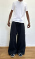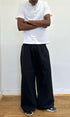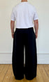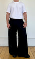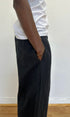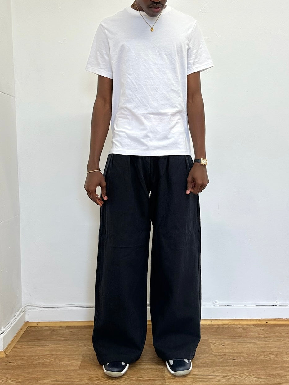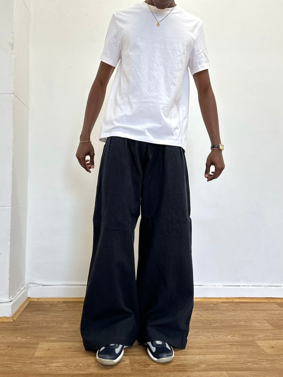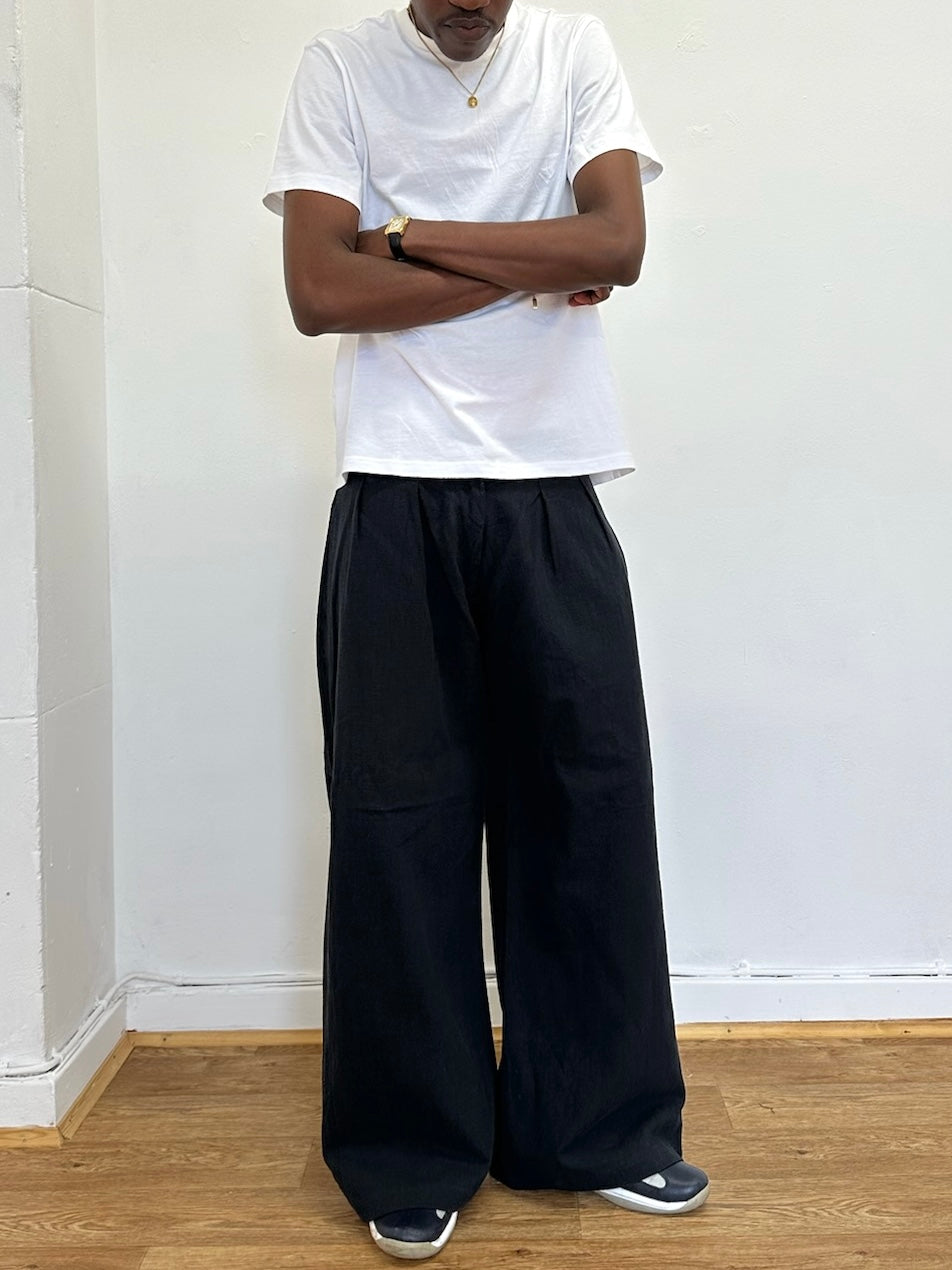 Eine schwarze Unisex-Leinenhose mit Bundfalten und weitem Bein. Aus 100 % Leinen. Der perfekte Smart-Casual-Look. Mit gesticktem, handgeschriebenem „Made in London“-Etikett.