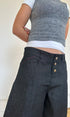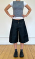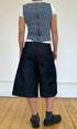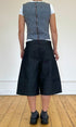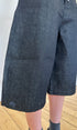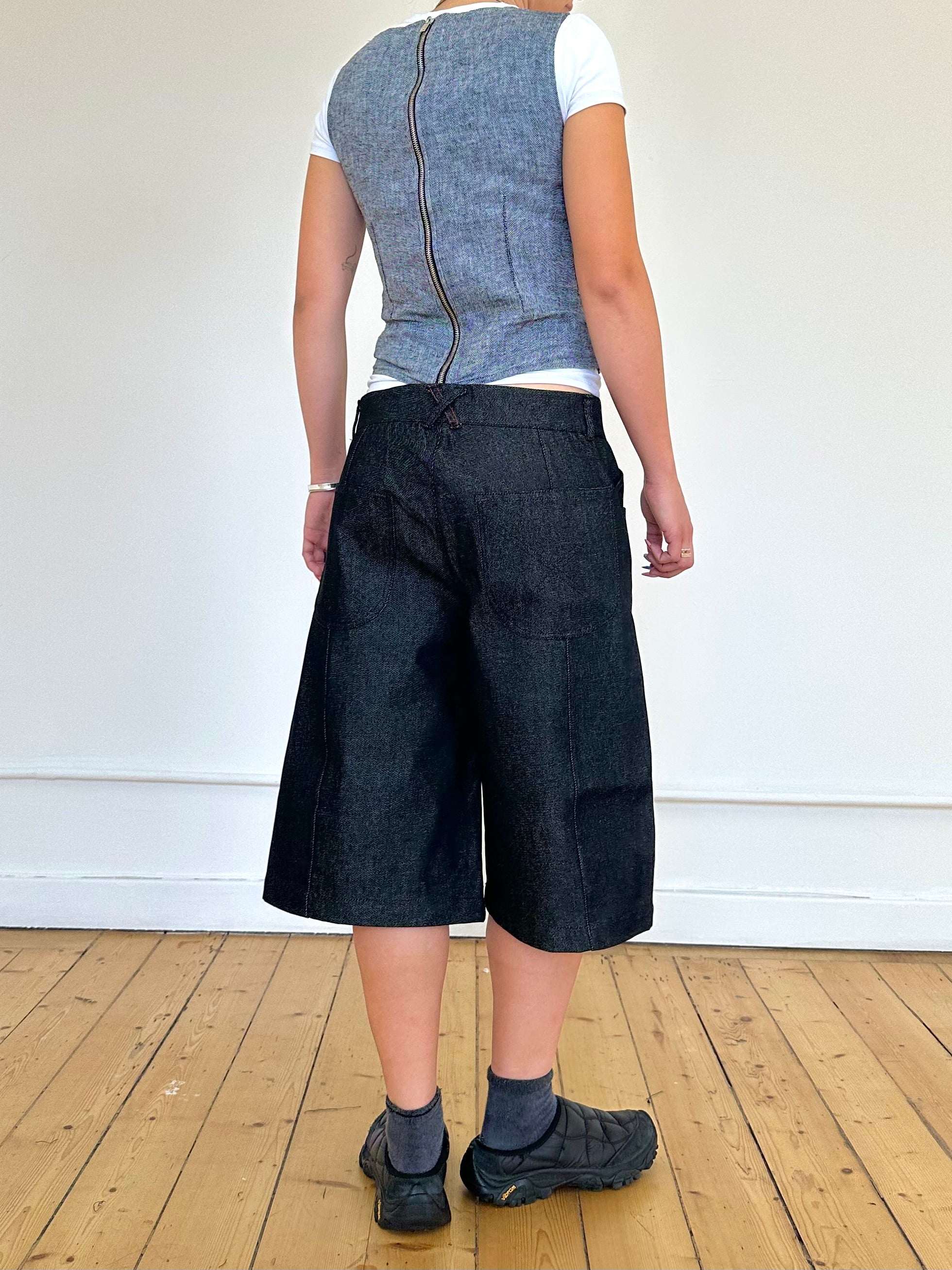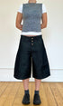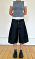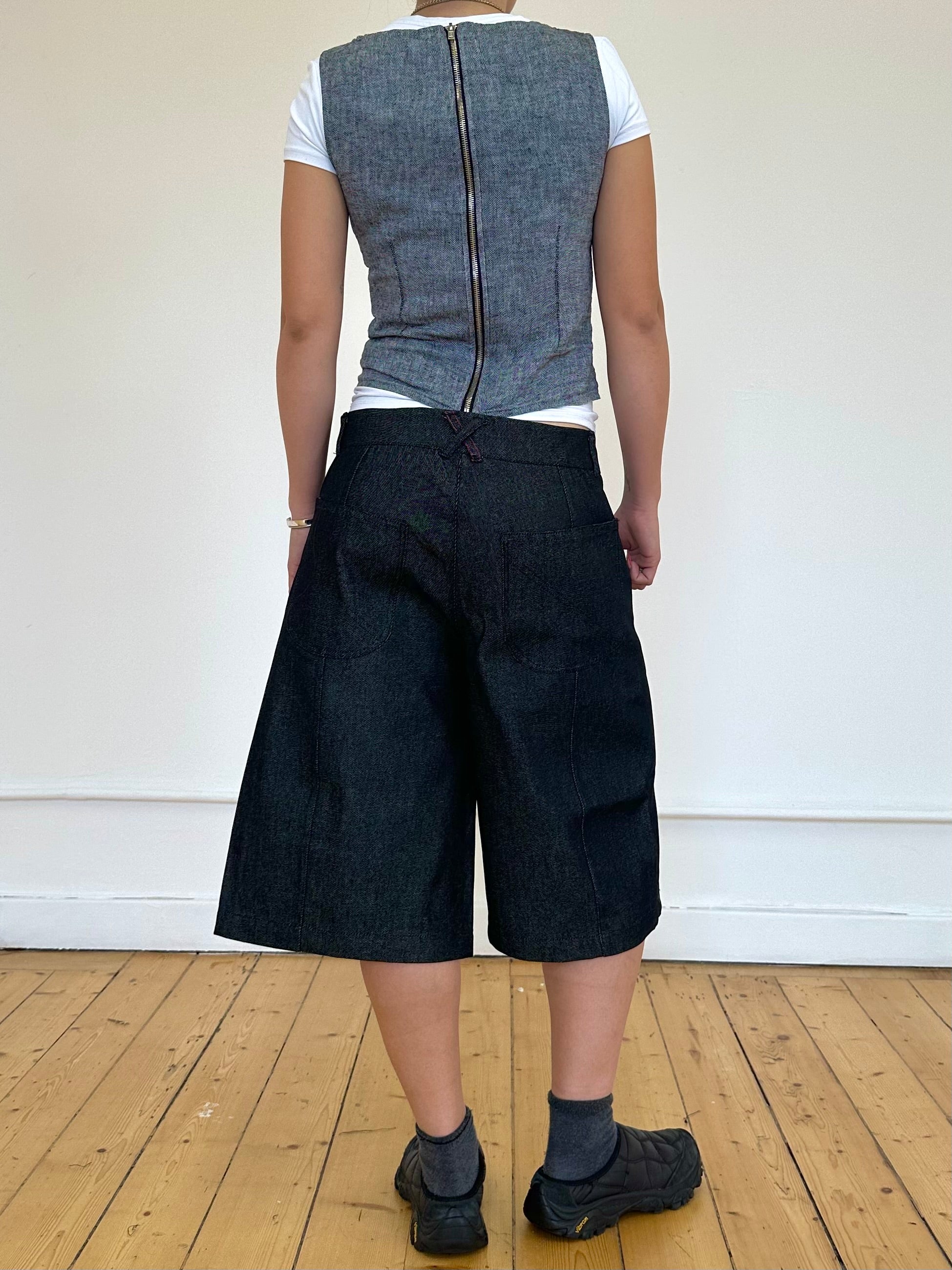 Eine weite, unisex Baggy-Jeansshorts in Dunkelgrau mit tiefem Schritt. Endet knapp unterhalb des Knies für einen schmeichelhaften Schnitt. Hergestellt aus Restbeständen an Raw Denim. Mit Drei-Knopf-Verschluss, Mittelnaht, gesticktem Logo und Kontrastnähten.