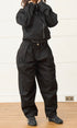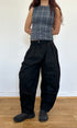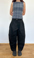 A unisex, pleated, barrel-shaped jean with a wide curved leg and tapered ankle. Made from deadstock 100% cotton black denim. Pairs perfectly with our matching jamie jacket.
