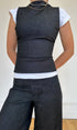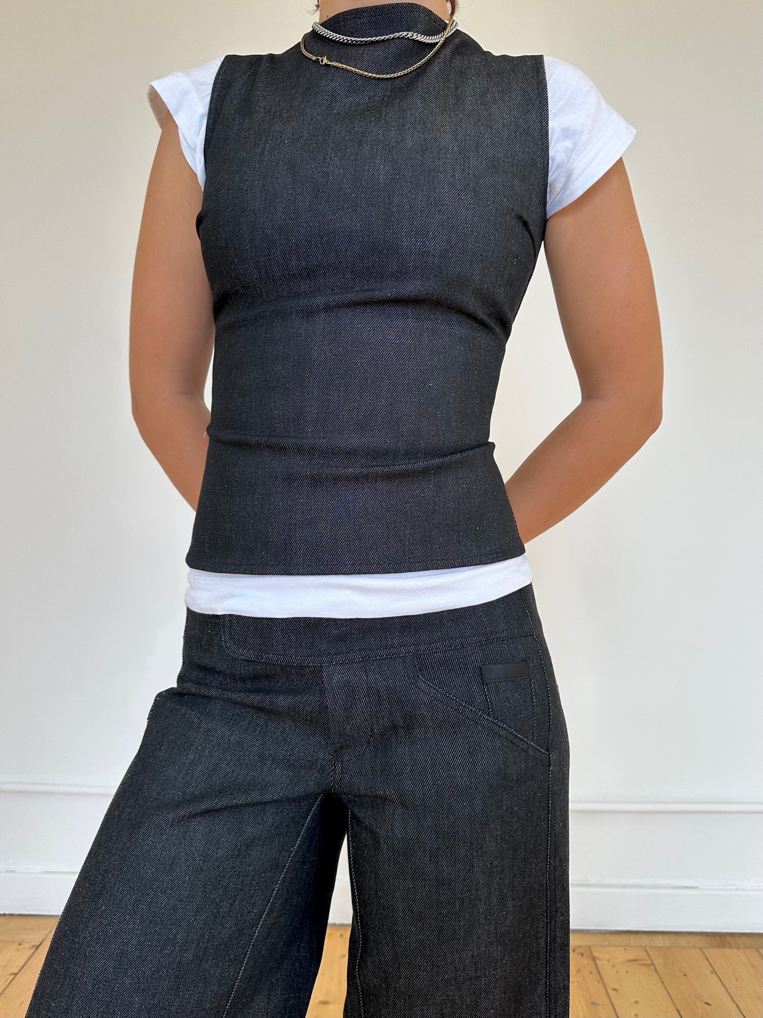 Un haut ajusté en denim gris foncé, zippé et sans manches. Avec une encolure bateau haute. À associer à notre bas en denim préféré pour un ensemble parfait.