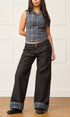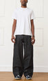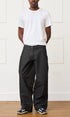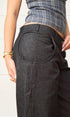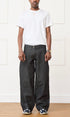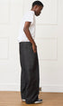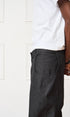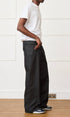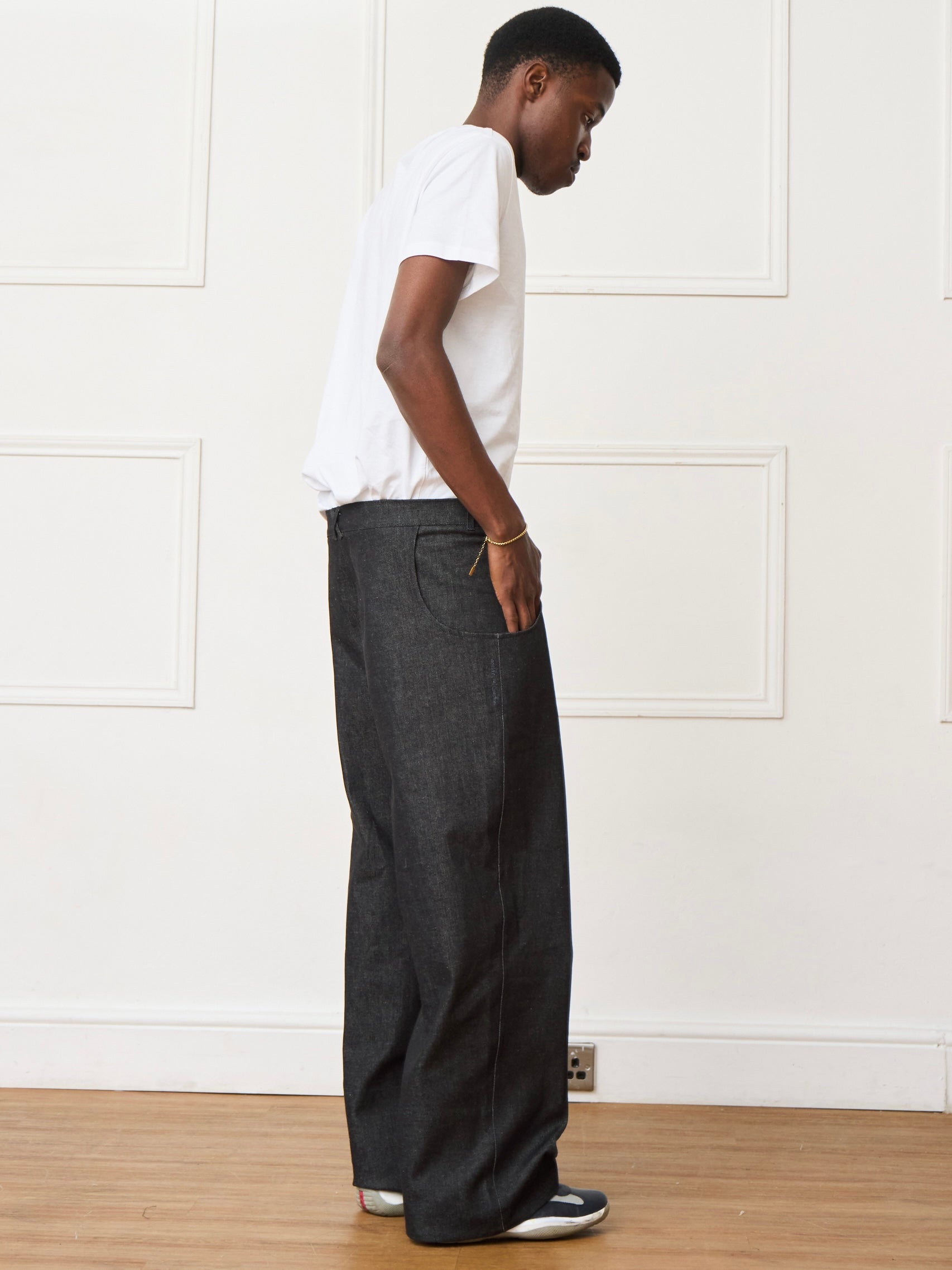 A unisex, relaxed, wide leg jean made from deadstock 100% cotton denim in dark grey. Featuring unique circle side pockets, a contrast Irish linen turn up hem & pocket lining and cross over belt loops. Finished with our embroidered 'made in london' tag.