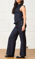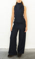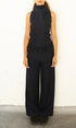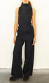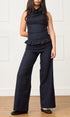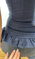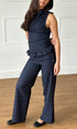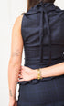 A high neck, tie up, sleeveless top with a peplum waistline in a 100% wool navy check. Featuring a side zip closure and tailored fit. Designed to pair with our shay trouser for the perfect layered silhouette.