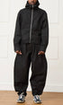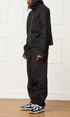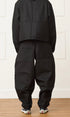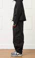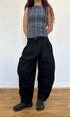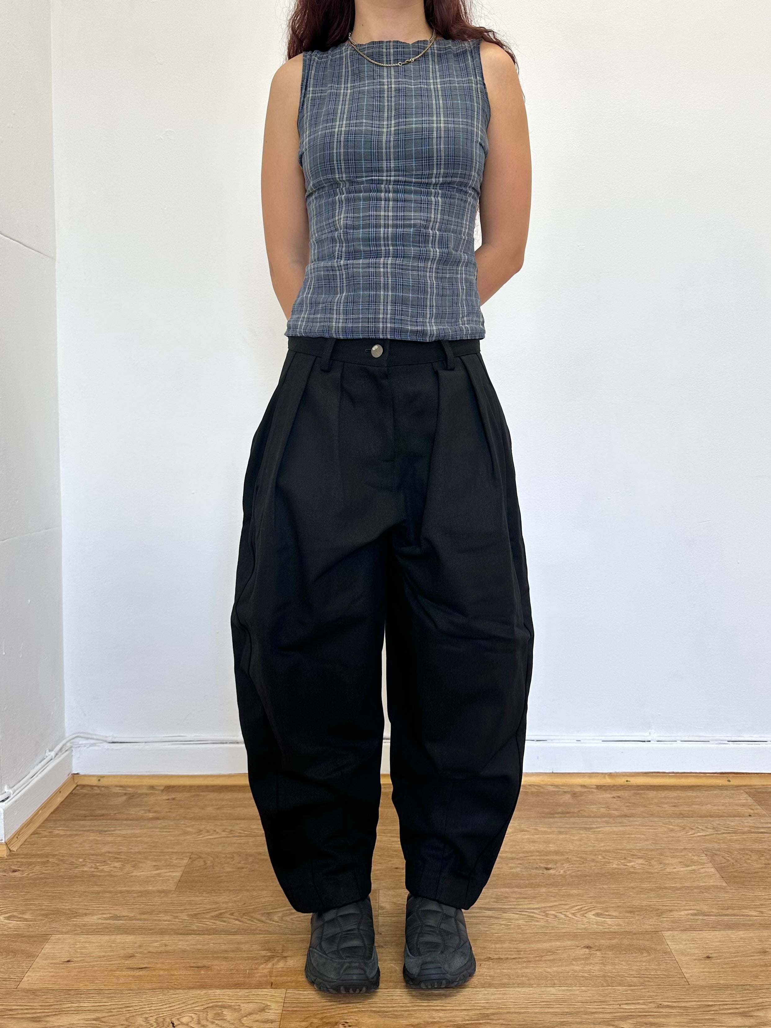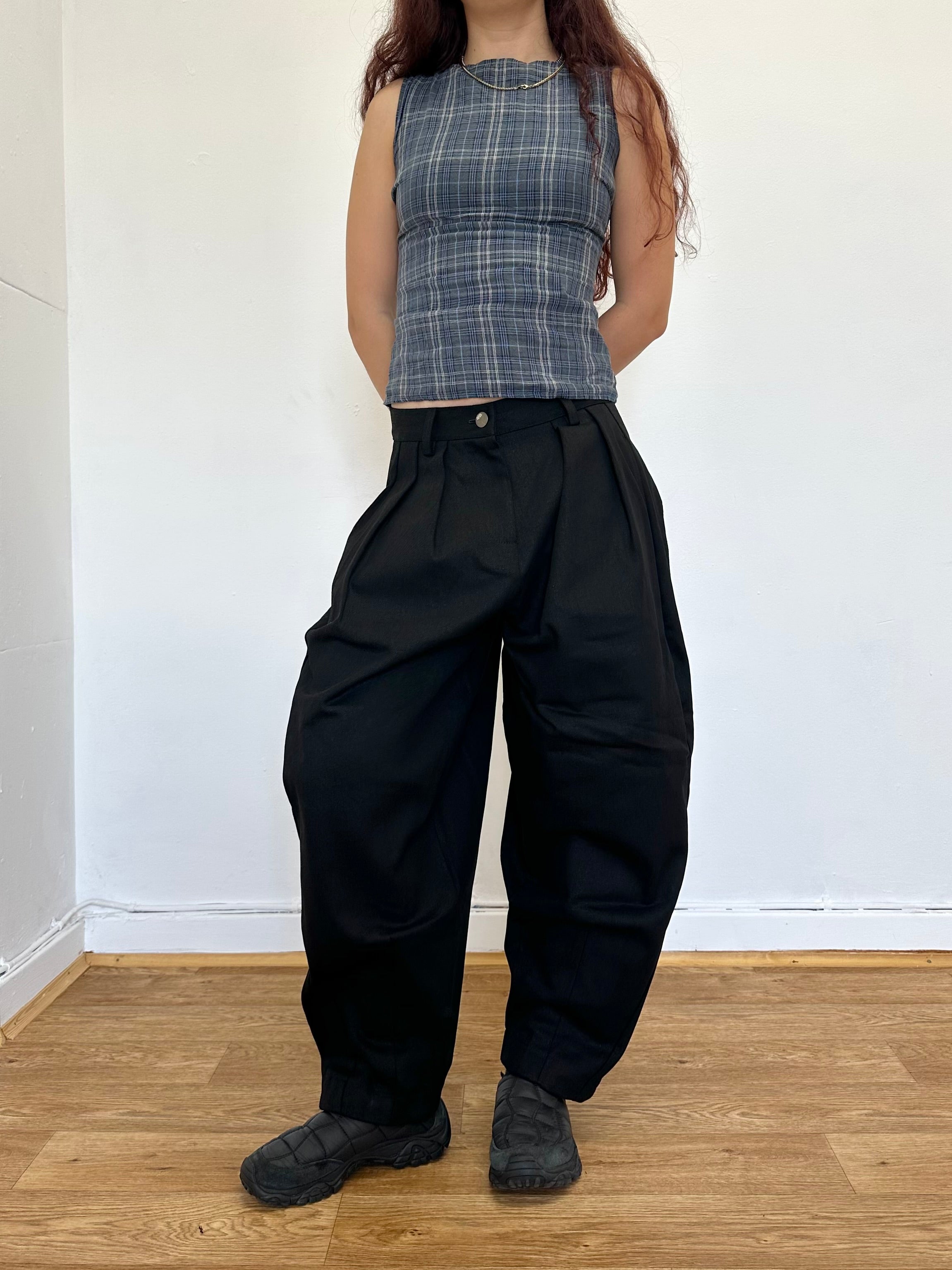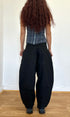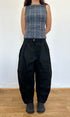 A unisex, pleated, barrel-shaped jean with a wide curved leg and tapered ankle. Made from deadstock 100% cotton black denim. Pairs perfectly with our matching jamie jacket.