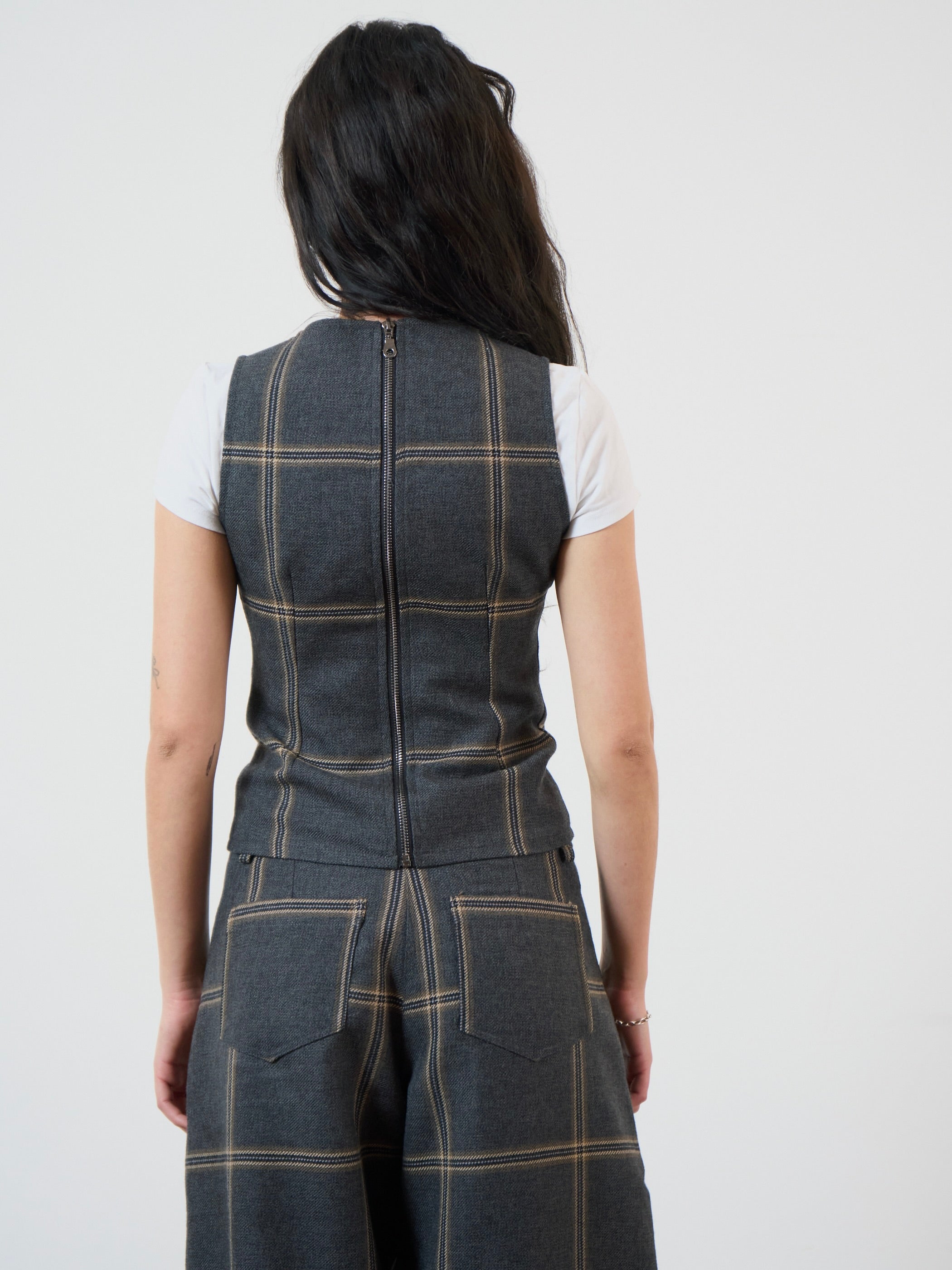 A tailored, zip up, sleeveless top with a loose, high boat neckline. Crafted from a 100% British woven wool in a grey check. Fully lined & designed to create the perfect 3 piece set with our parker trouser & jamie jacket.
