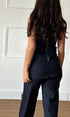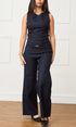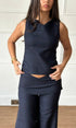 A tailored, zip up, sleeveless top with a loose, high boat neckline. Crafted from a soft 100% British woven wool in navy check. Designed to pair with our shay trouser.