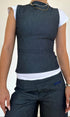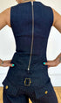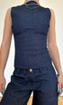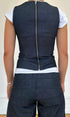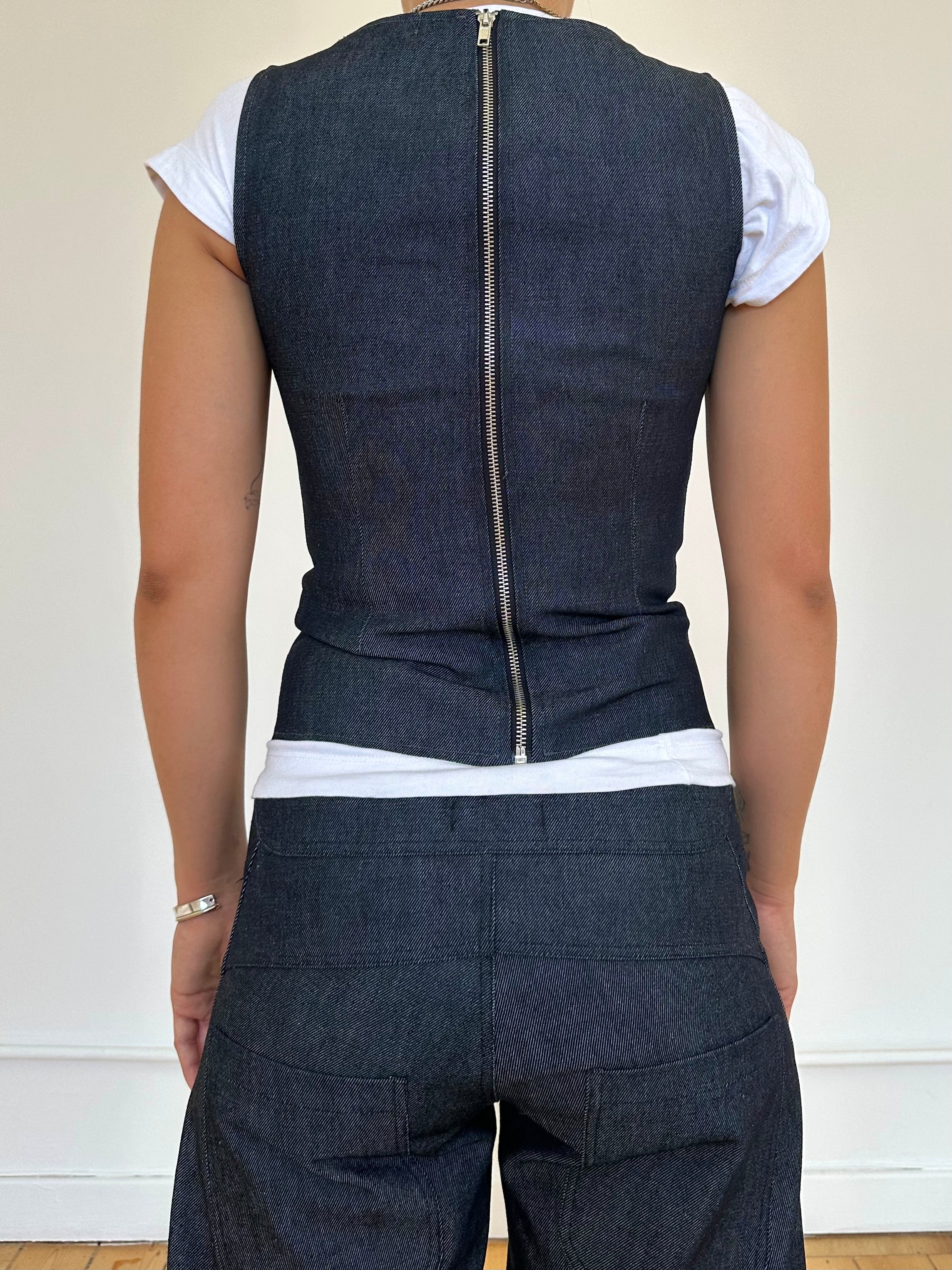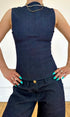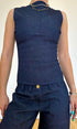 A tailored, zip up, sleeveless, navy denim top. With a high boat neckline. Designed to pair with our bestselling denim bottoms for the perfect double denim set.