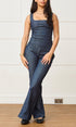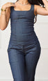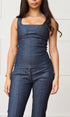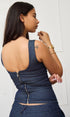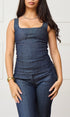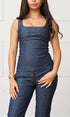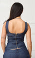 A figure hugging, square neck corset style top made from deadstock stretch navy denim. Features seam detailing, red contrast stitching and a zip up back. Made to pair with our frankie jean for a shapely double denim set.