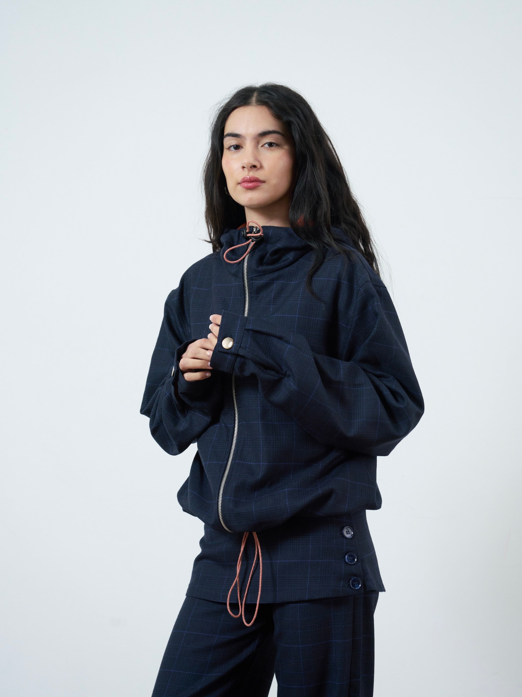 A unisex, zip up, hooded jacket. Made from 100% British woven wool in a navy check and featuring an adjustable toggle waist and hood with Japanese cord. Fully lined with a contrast orange lining and finished with our embroidered K&R logo. The perfect set with our matching charlie top & shay trouser.