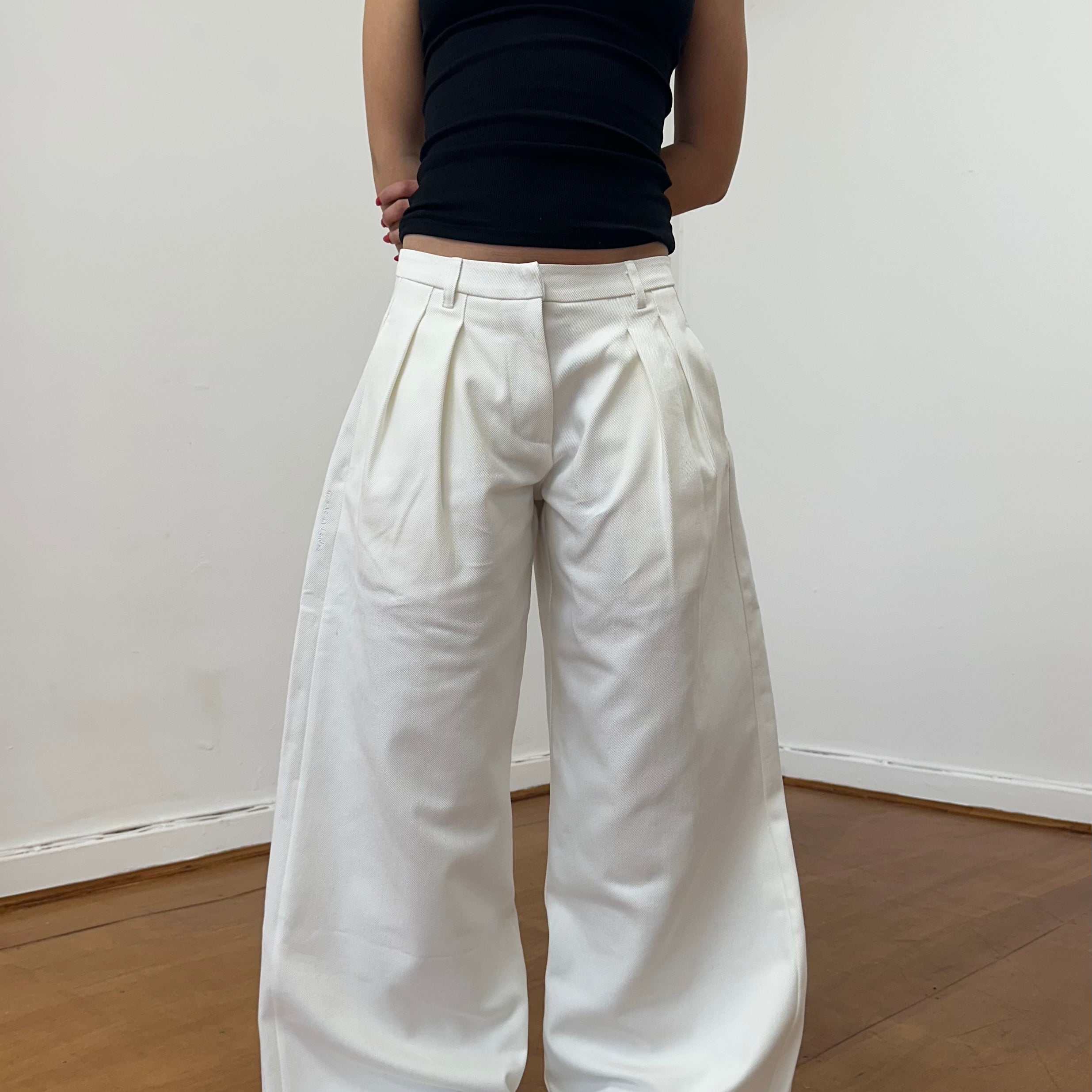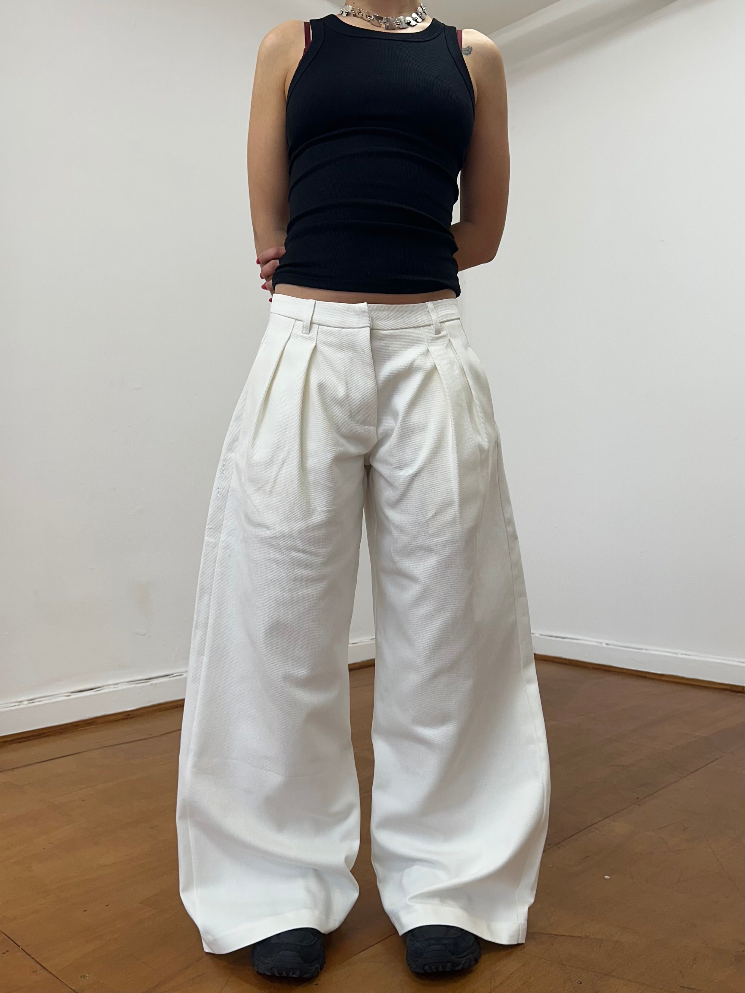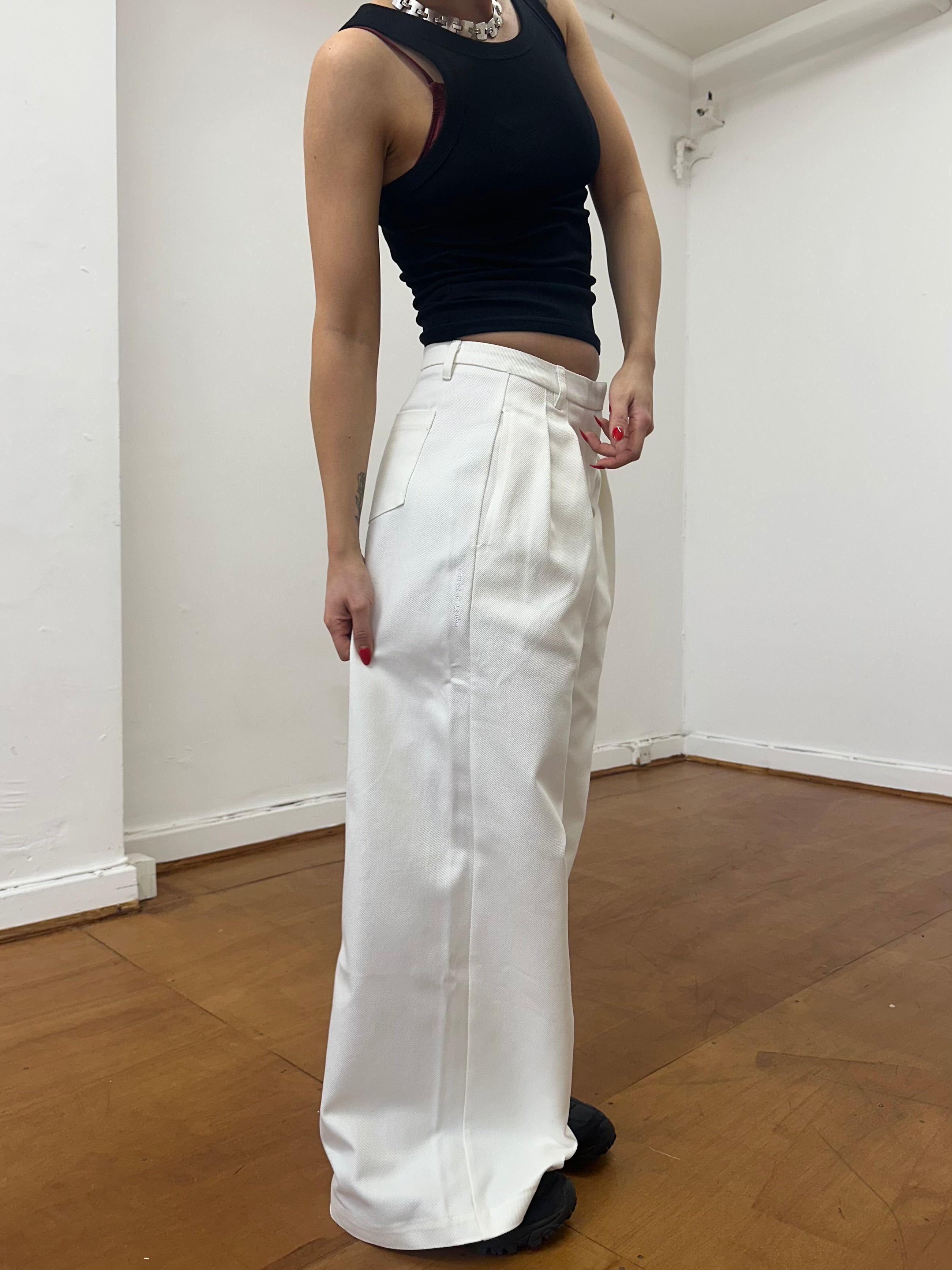 A unisex, wide leg , pleated, white denim jean. Made from raw denim. The perfect smart casual look. Featuring an embroidered handwritten 'made in london' tag.