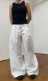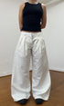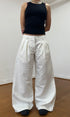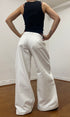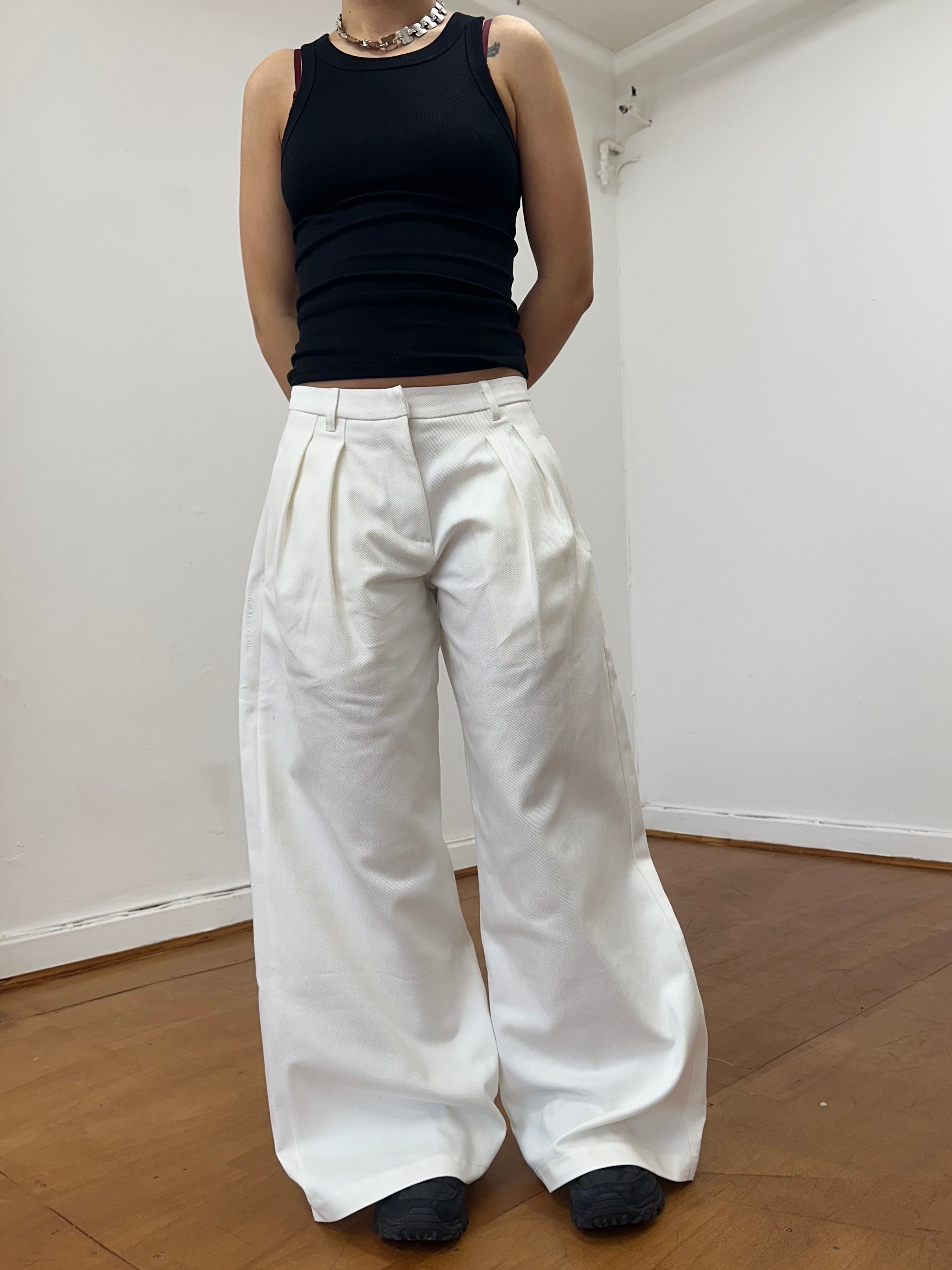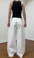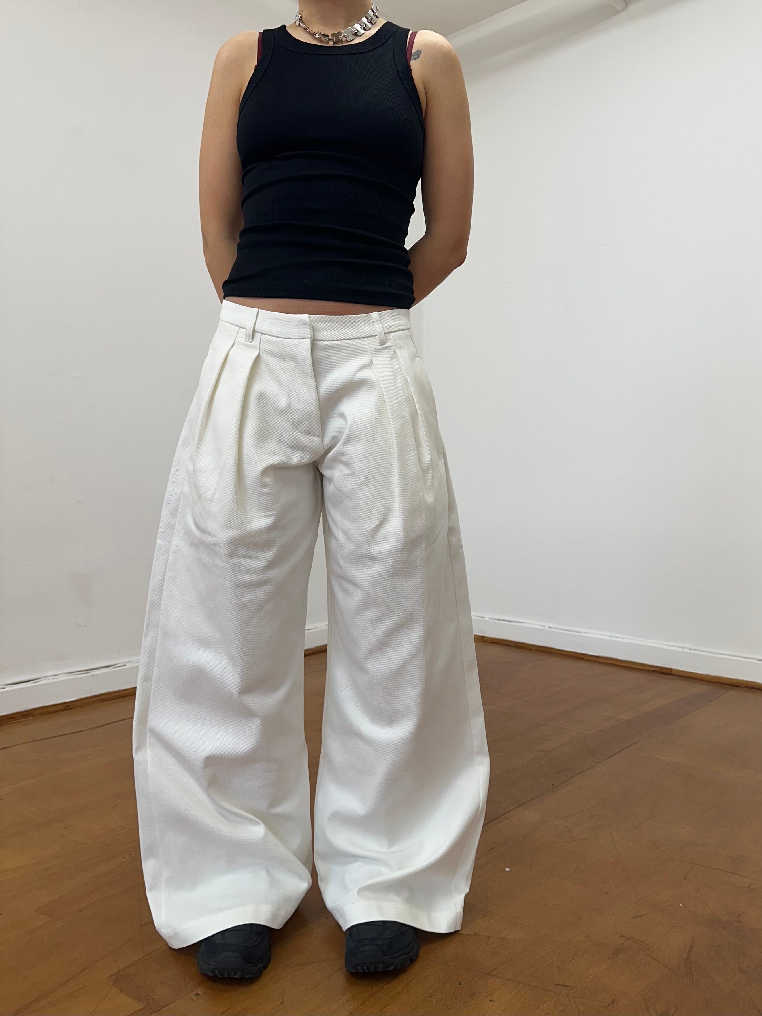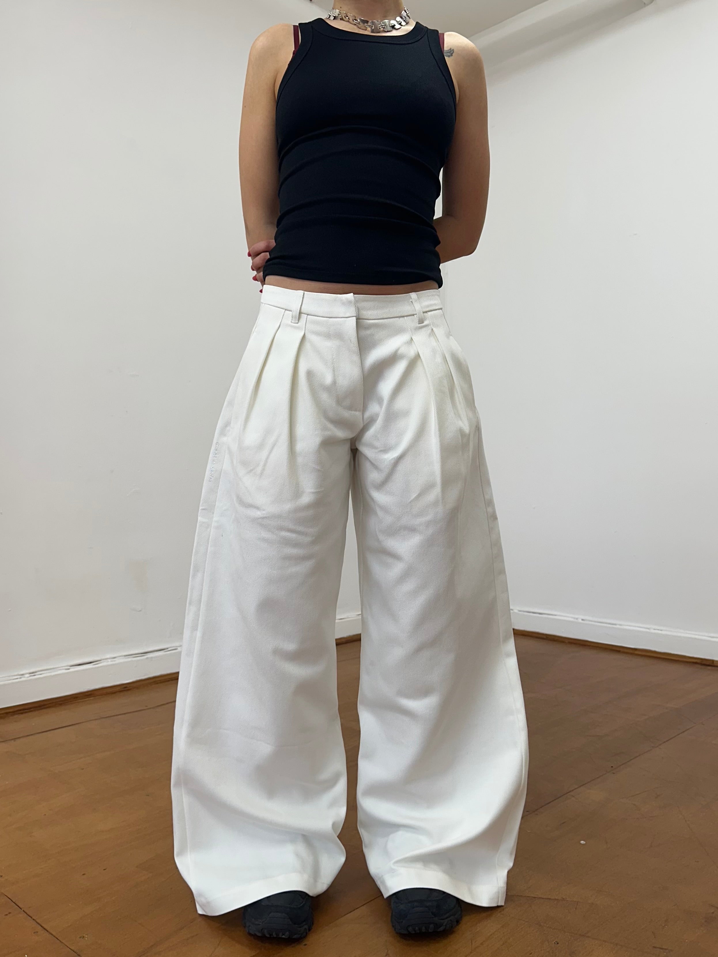 A unisex, wide leg , pleated, white denim jean. Made from raw denim. The perfect smart casual look. Featuring an embroidered handwritten 'made in london' tag.