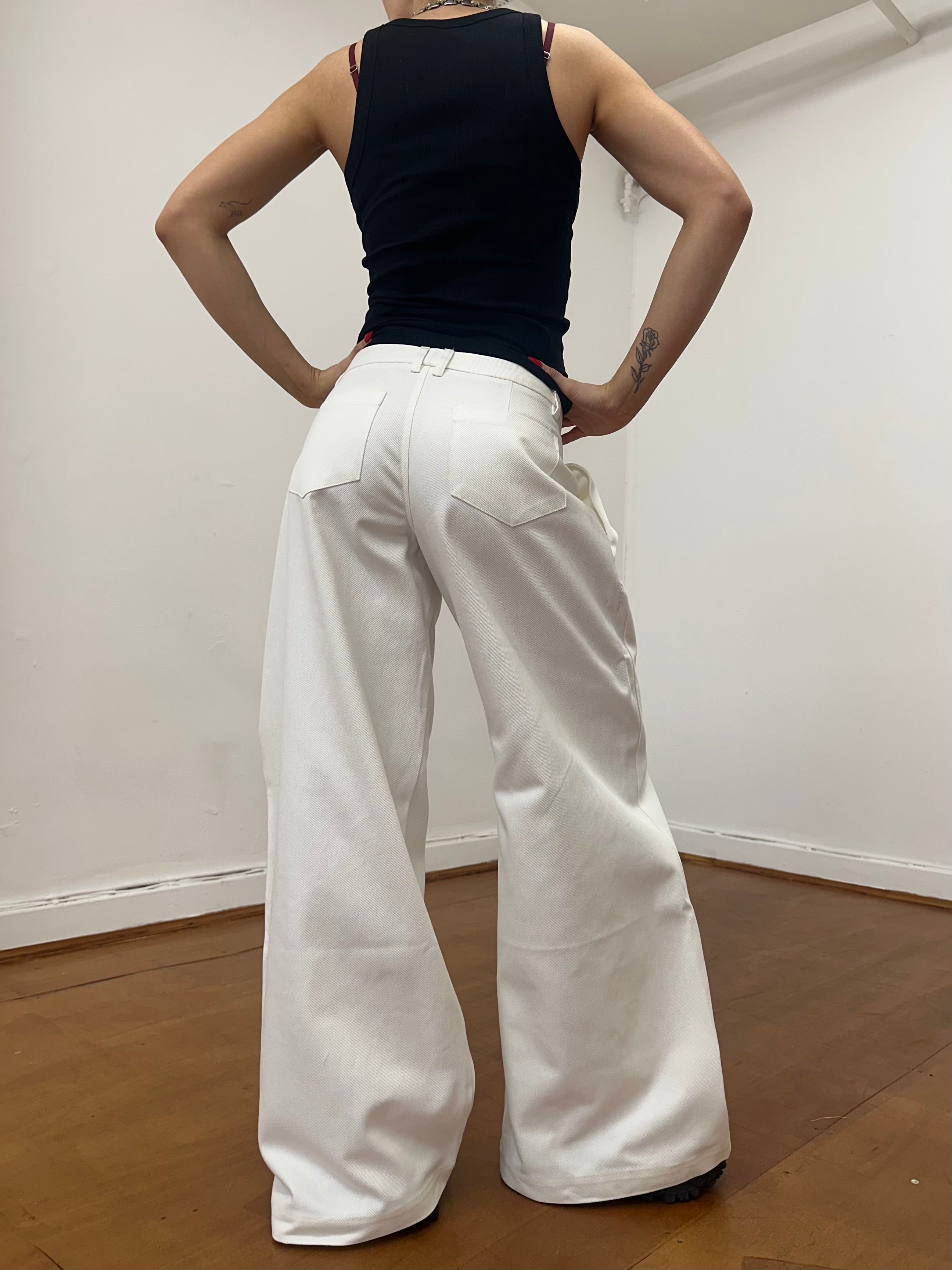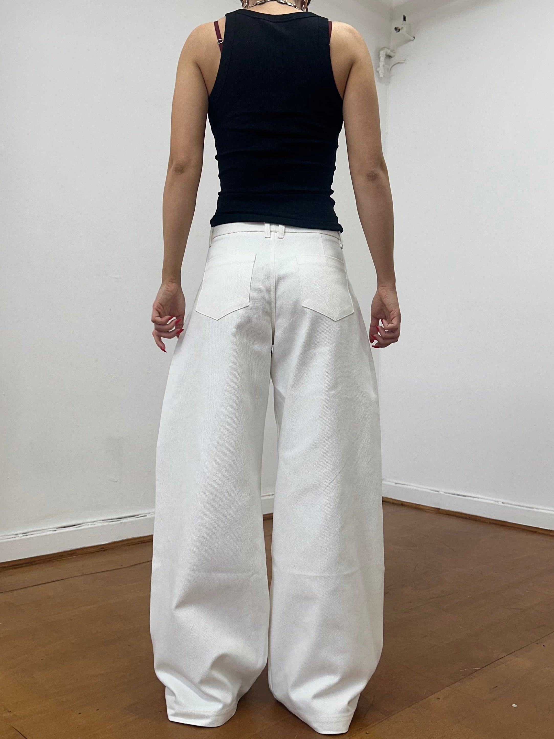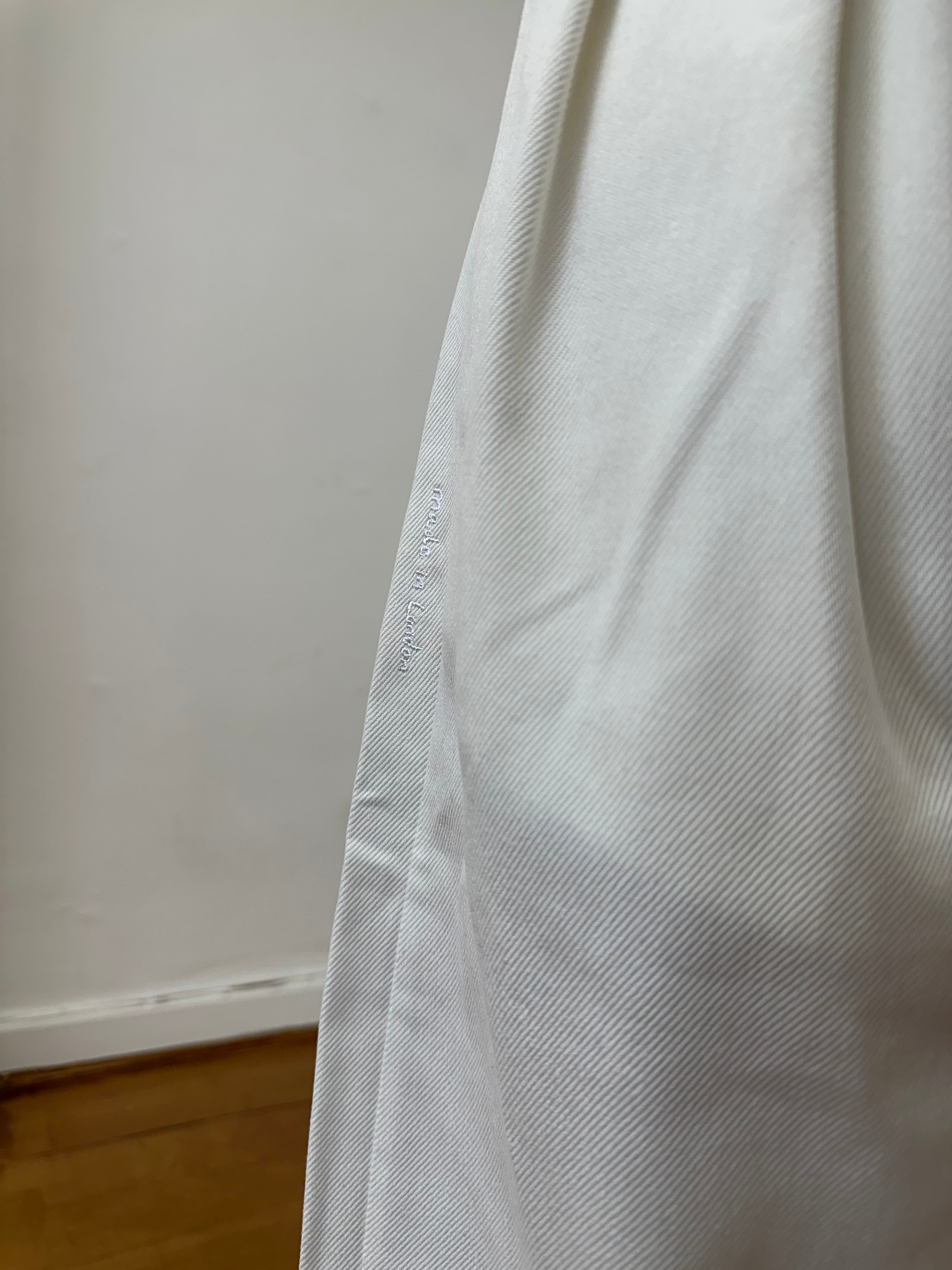 White denim: 70% cotton, 15% polyester, 15% viscose (deadstock)
