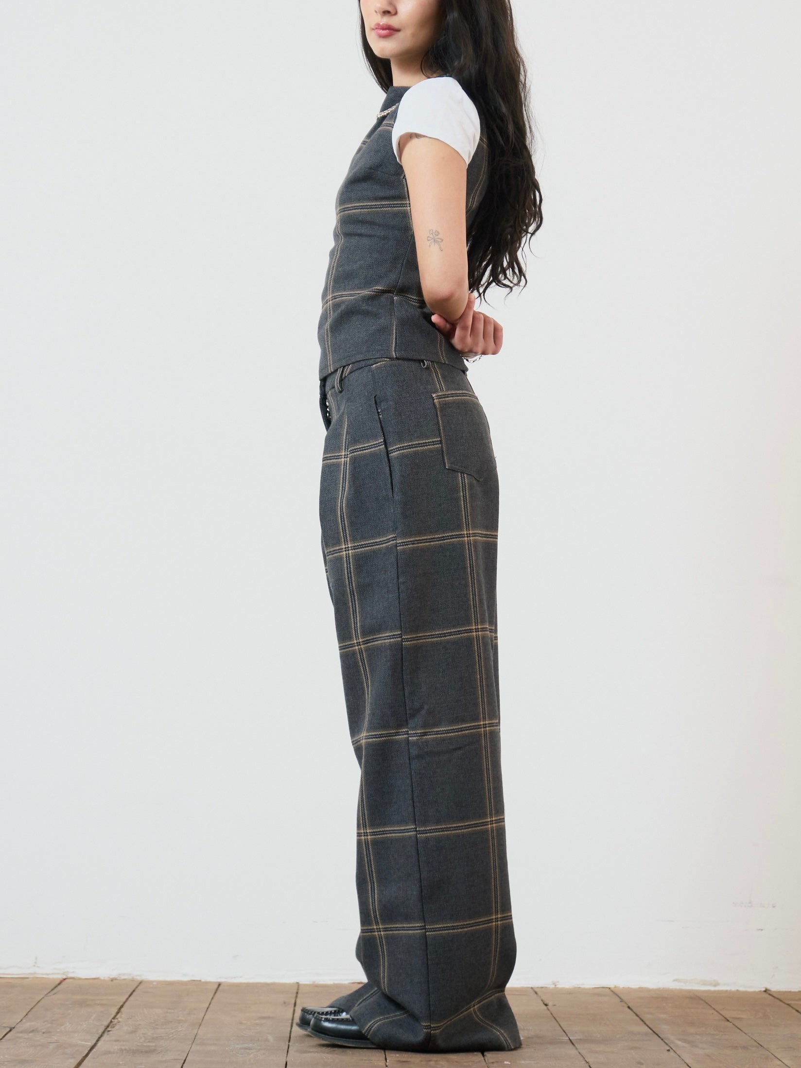 A unisex, pleated, trouser in a wide leg silhouette. Made from 100% British woven wool in a grey wool. check. Fully lined and featuring an embroidered handwritten 'made in london' tag. The perfect smart casual look.
