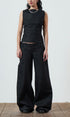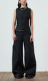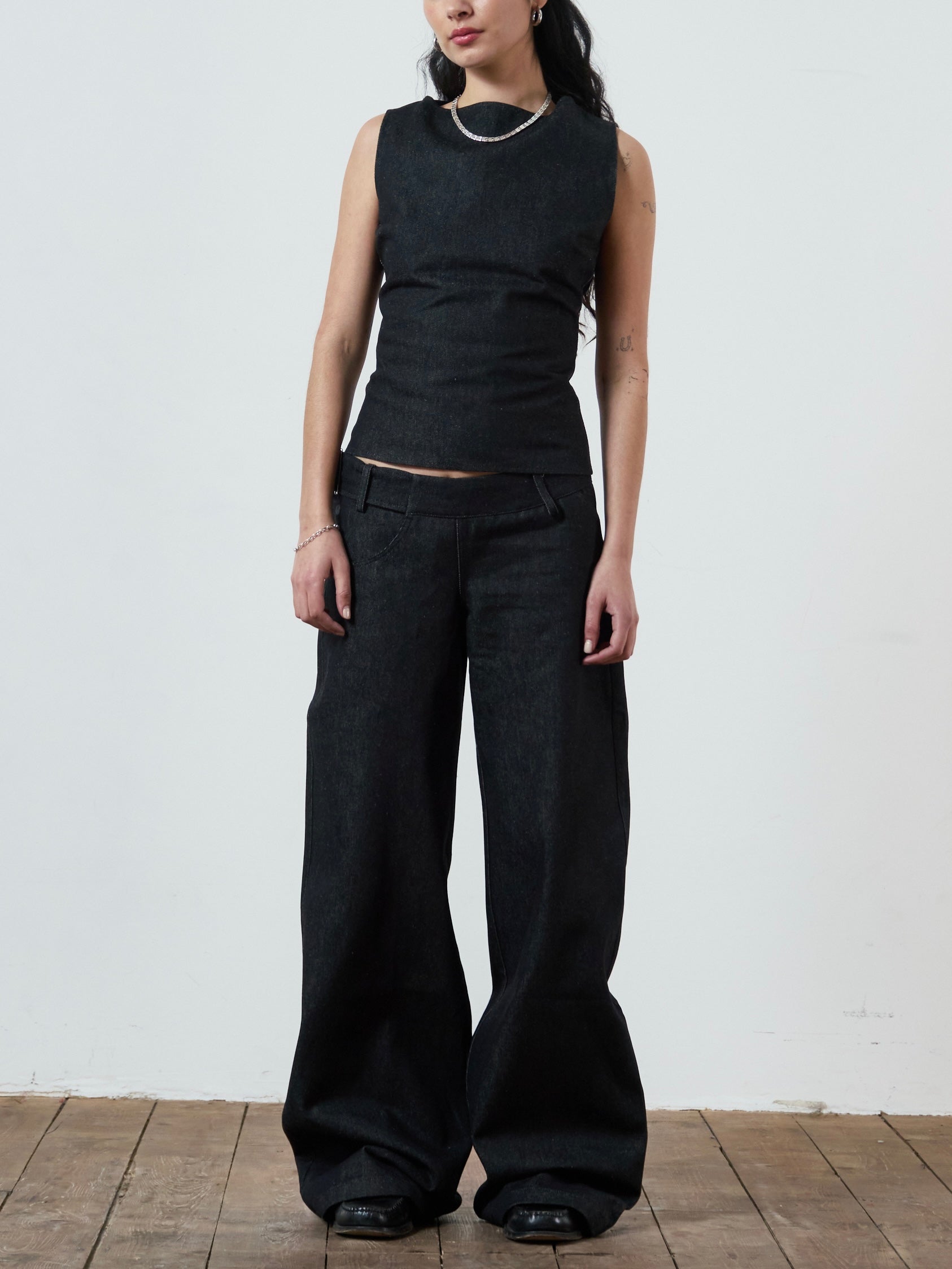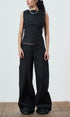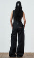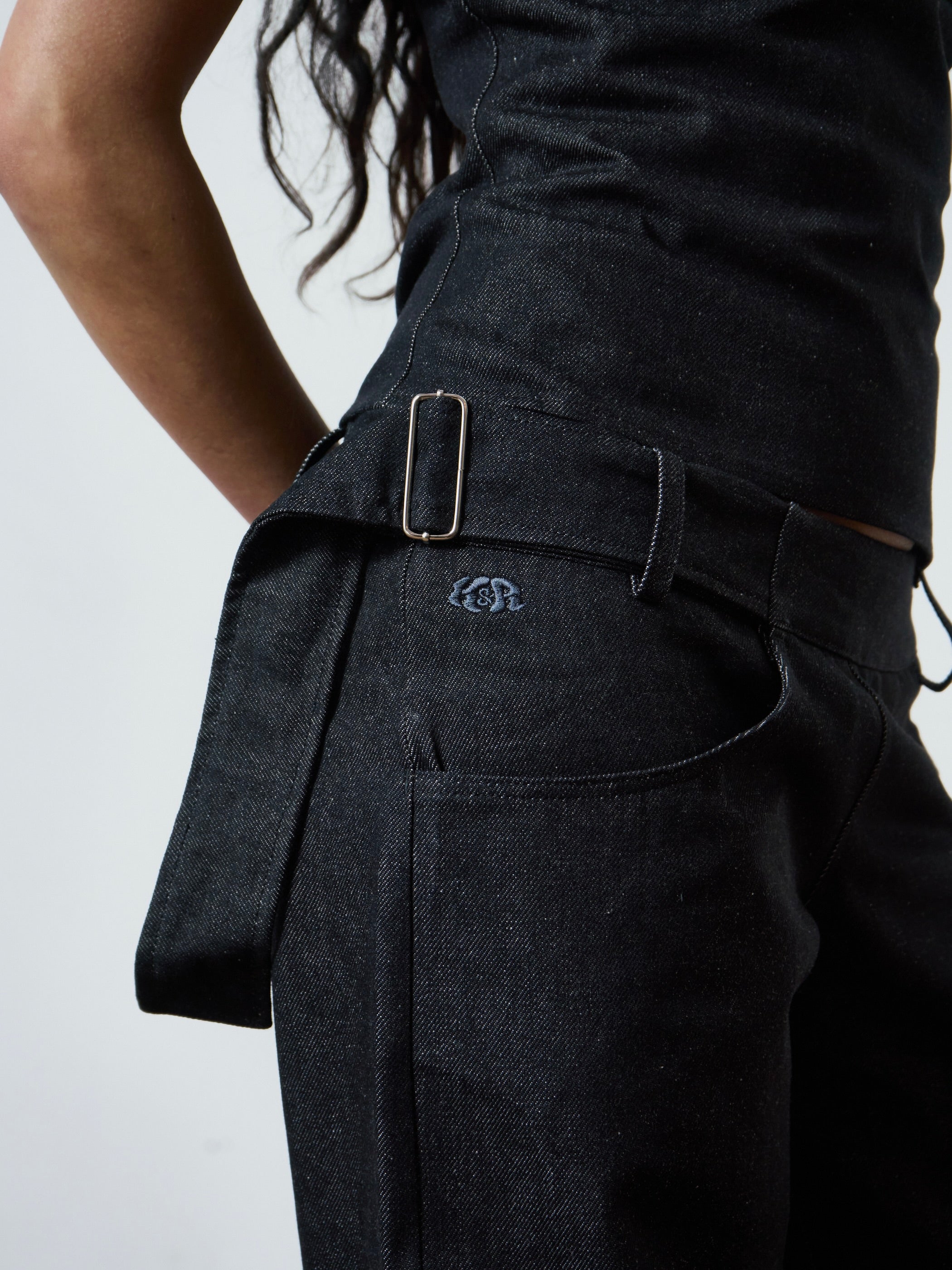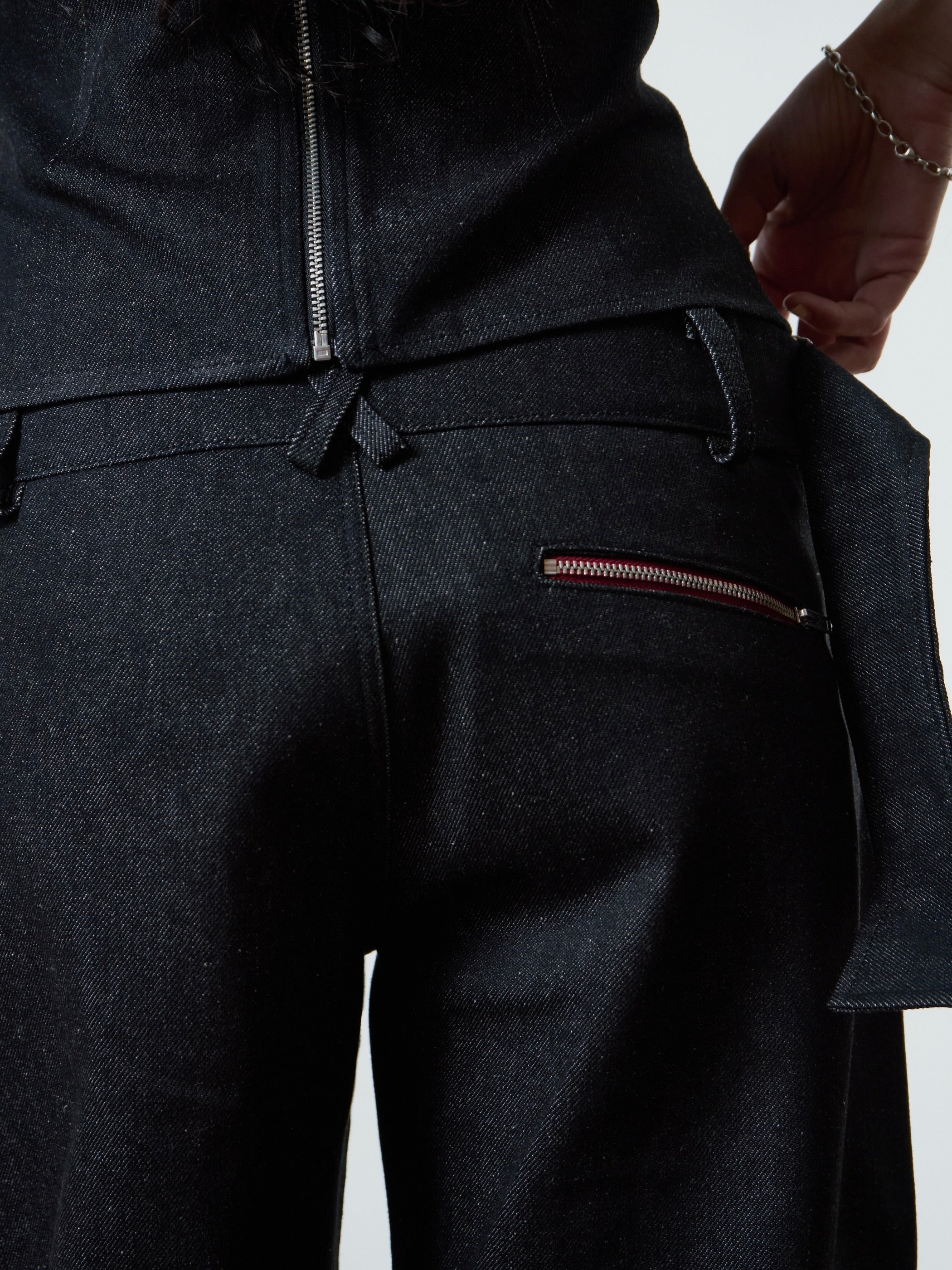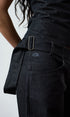 A wide leg, dark grey, denim jean with a fully adjustable belted waist for the perfect fit. Made from raw denim. Sits mid - low rise. Features front & back pockets with our classic contrast red zip, an asymmetric zip fly & button closure and embroidered logo.