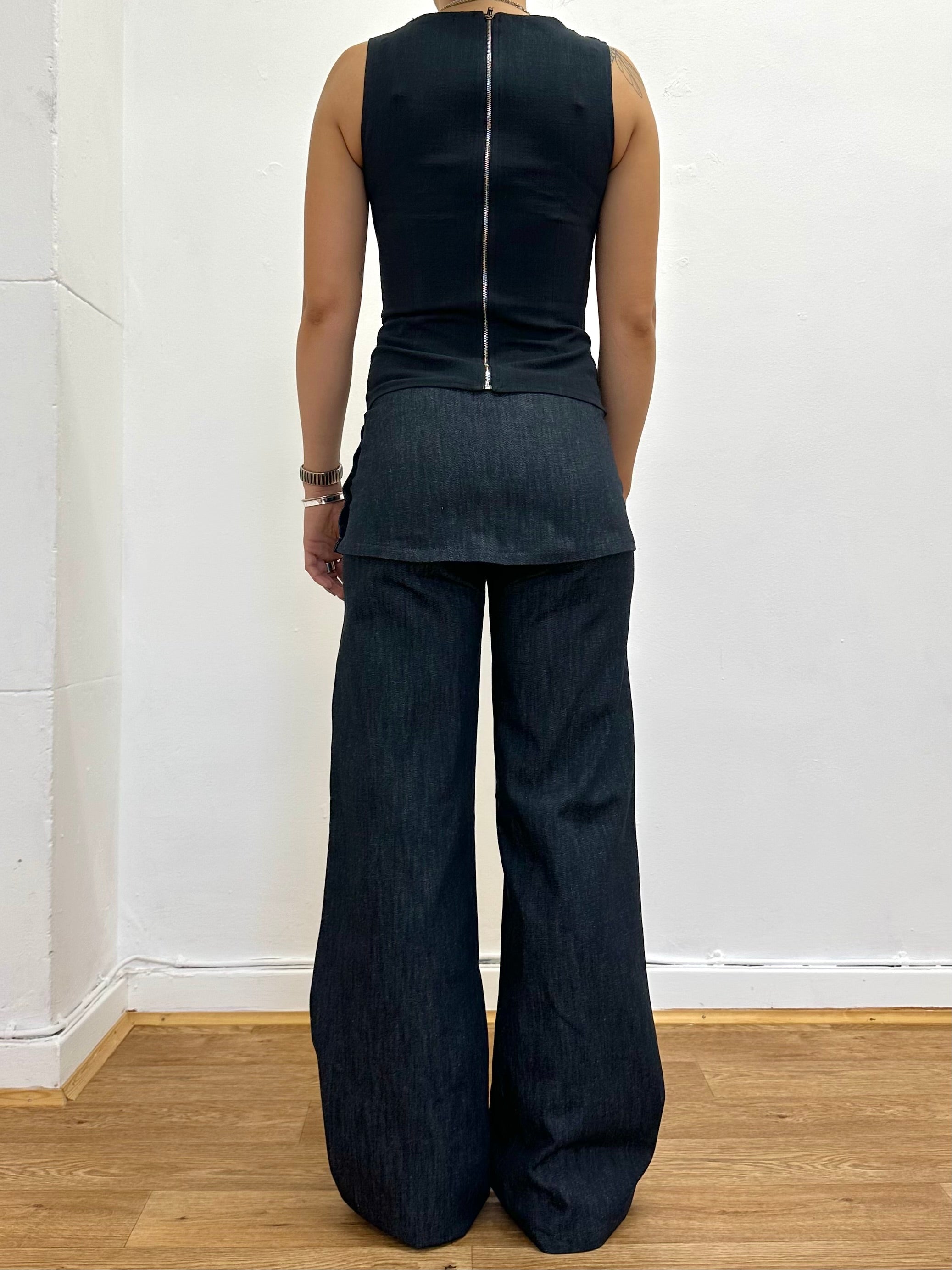 An elevated trouser, crafted from a deadstock light weight denim. Features a mini layered skirt with zip & button closure. Finished with our K&R engraved buttons. The perfect matching set with the charlie or alex top.