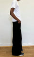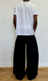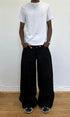 A wide leg, unisex, baggy black denim jean with a drop crotch. Made from deadstock raw denim. Featuring a three button closure, centre seam, embroidered logo and contrast stitching.