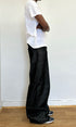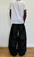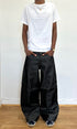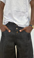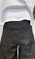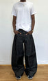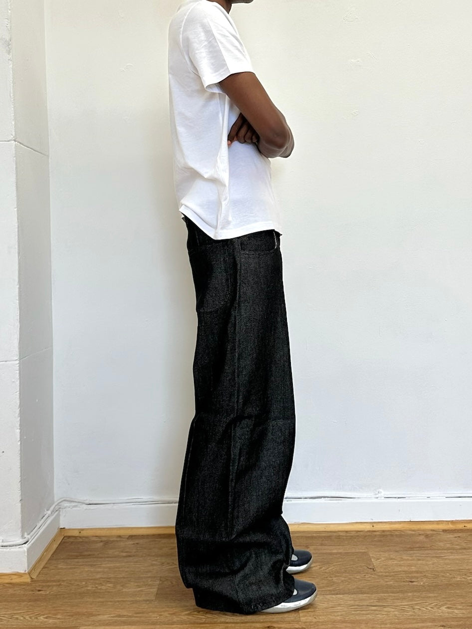 A wide leg, unisex, baggy dark grey denim jean with a drop crotch. Made from deadstock raw denim. Featuring a three button closure, centre seam, embroidered logo and contrast stitching.