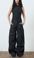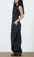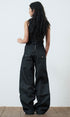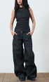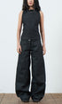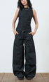 A wide leg, dark grey denim jean. Made from raw denim. Features an adjustable buckle back, front and back pockets and cross over belt loops. Inspired by 90's hip-hop fashion, a seamless blend between smart and casual.