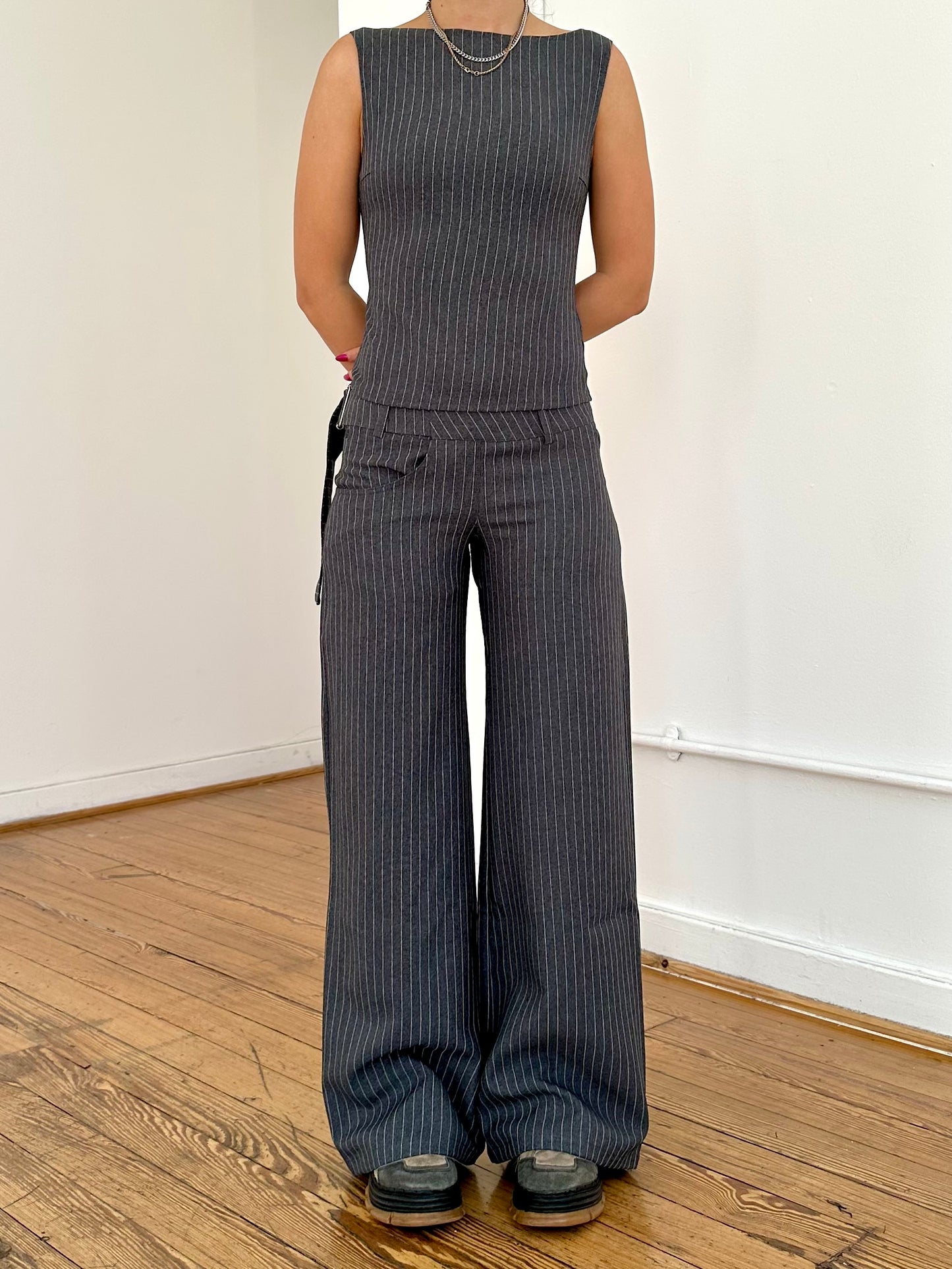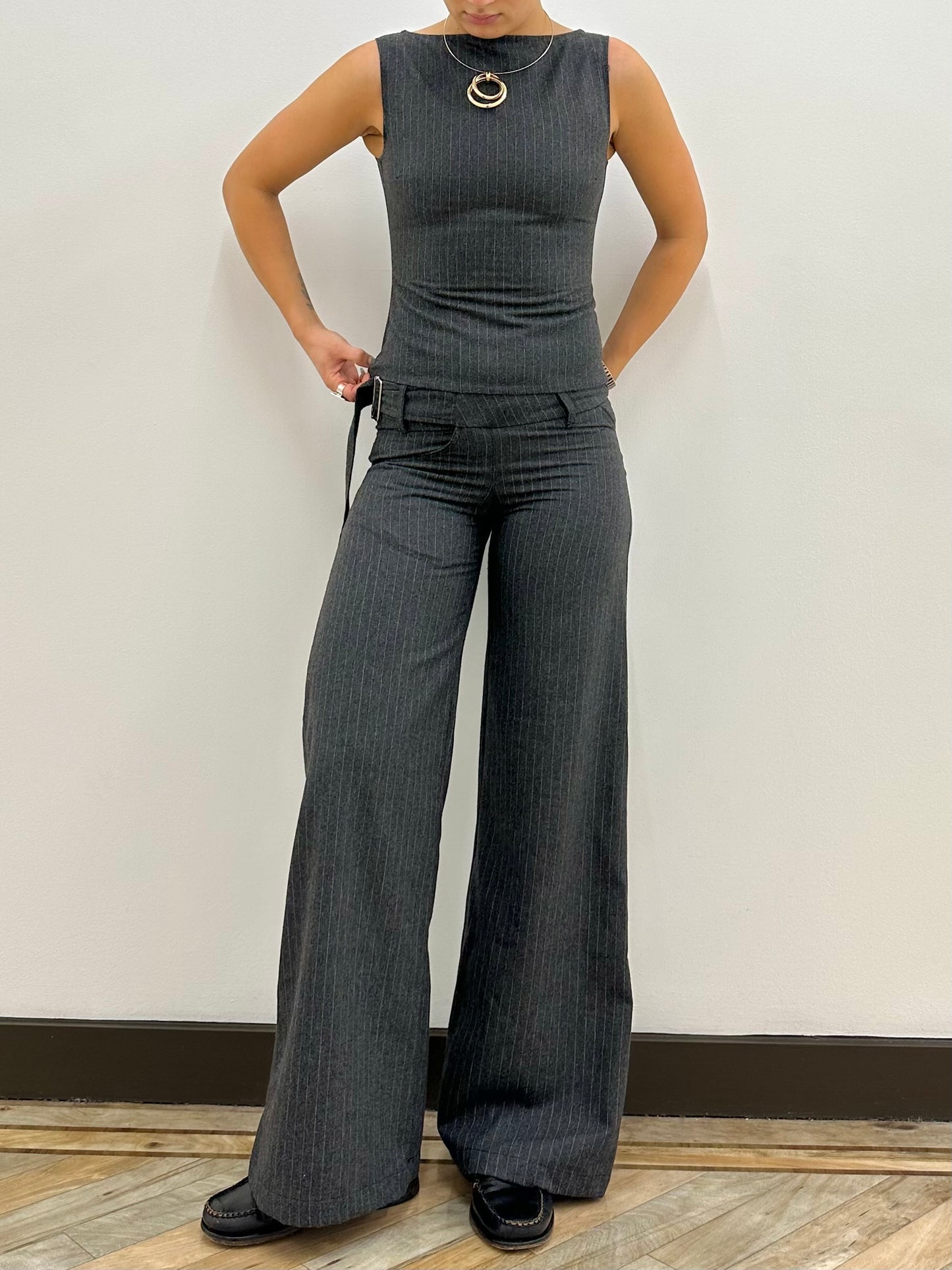 A wide leg, grey pinstripe trouser with a fully adjustable belted waist for the perfect fit. The perfect officewear trouser. Sits mid - low rise. Features front & back pockets, an asymmetric zip fly closure and embroidered logo. Pair with our matching charlie top for an effortlessly stylish officewear set.