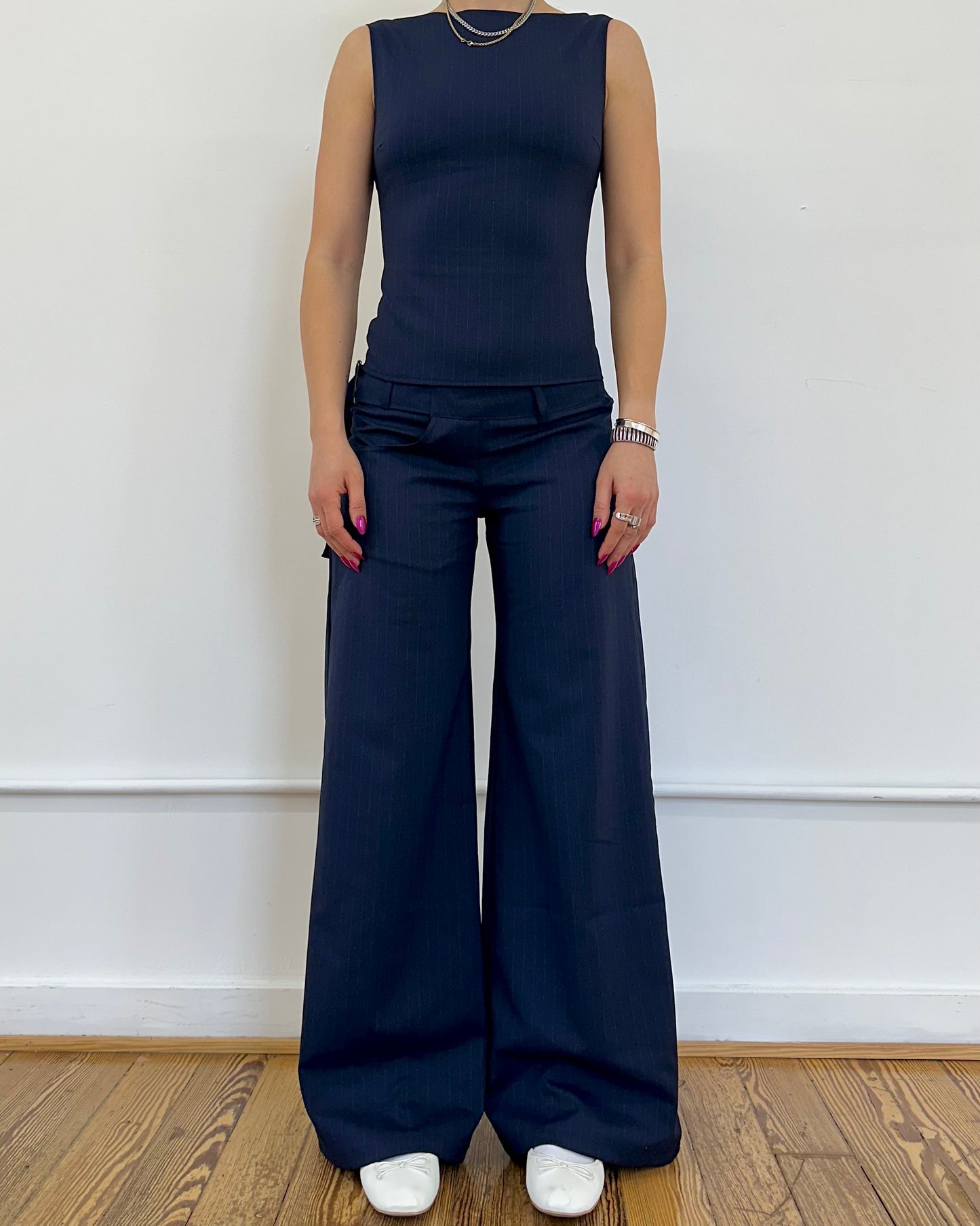 the roman trouser in navy pinstripe - 50% cotton, 30% wool, 20% polyester (deadstock)