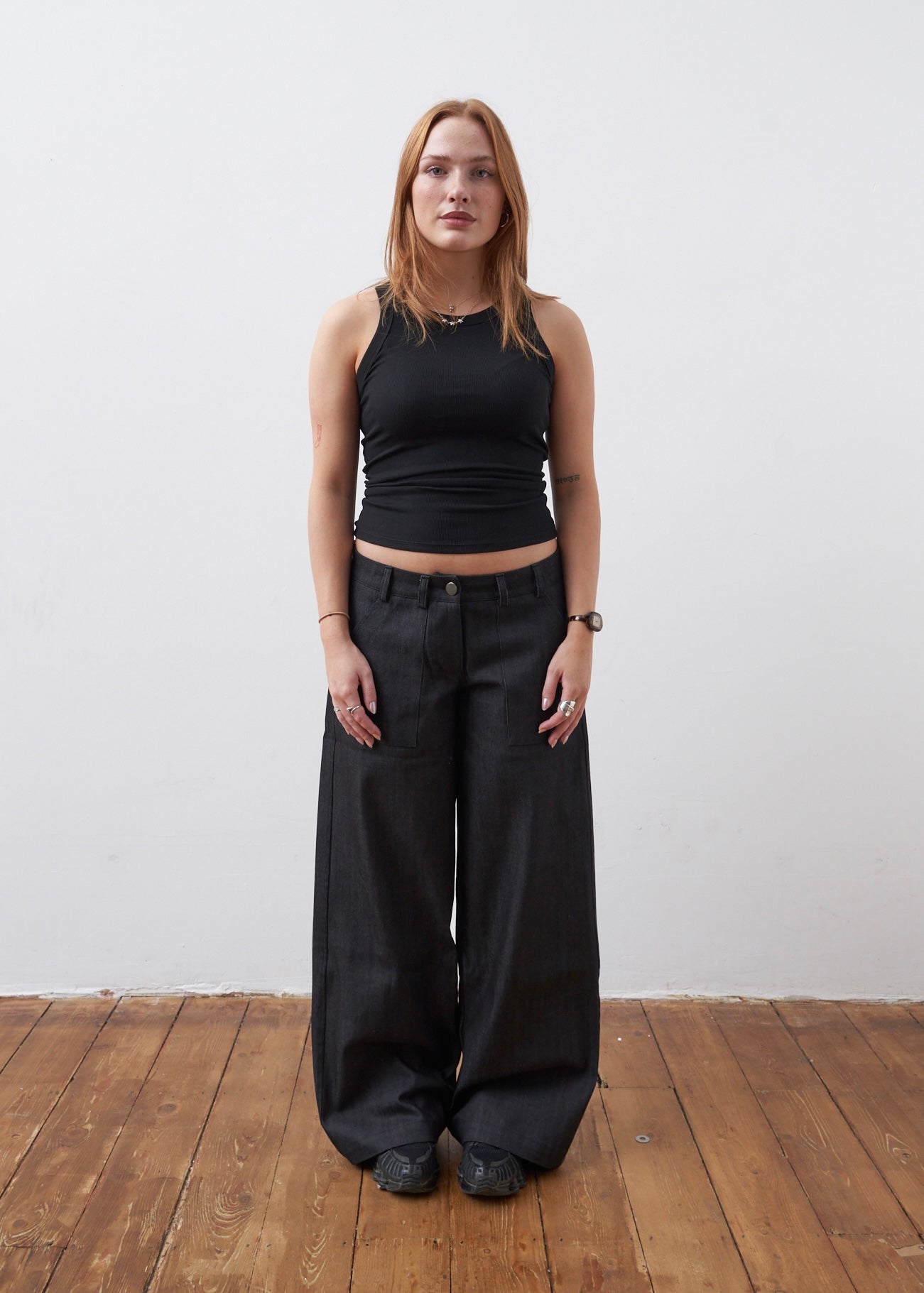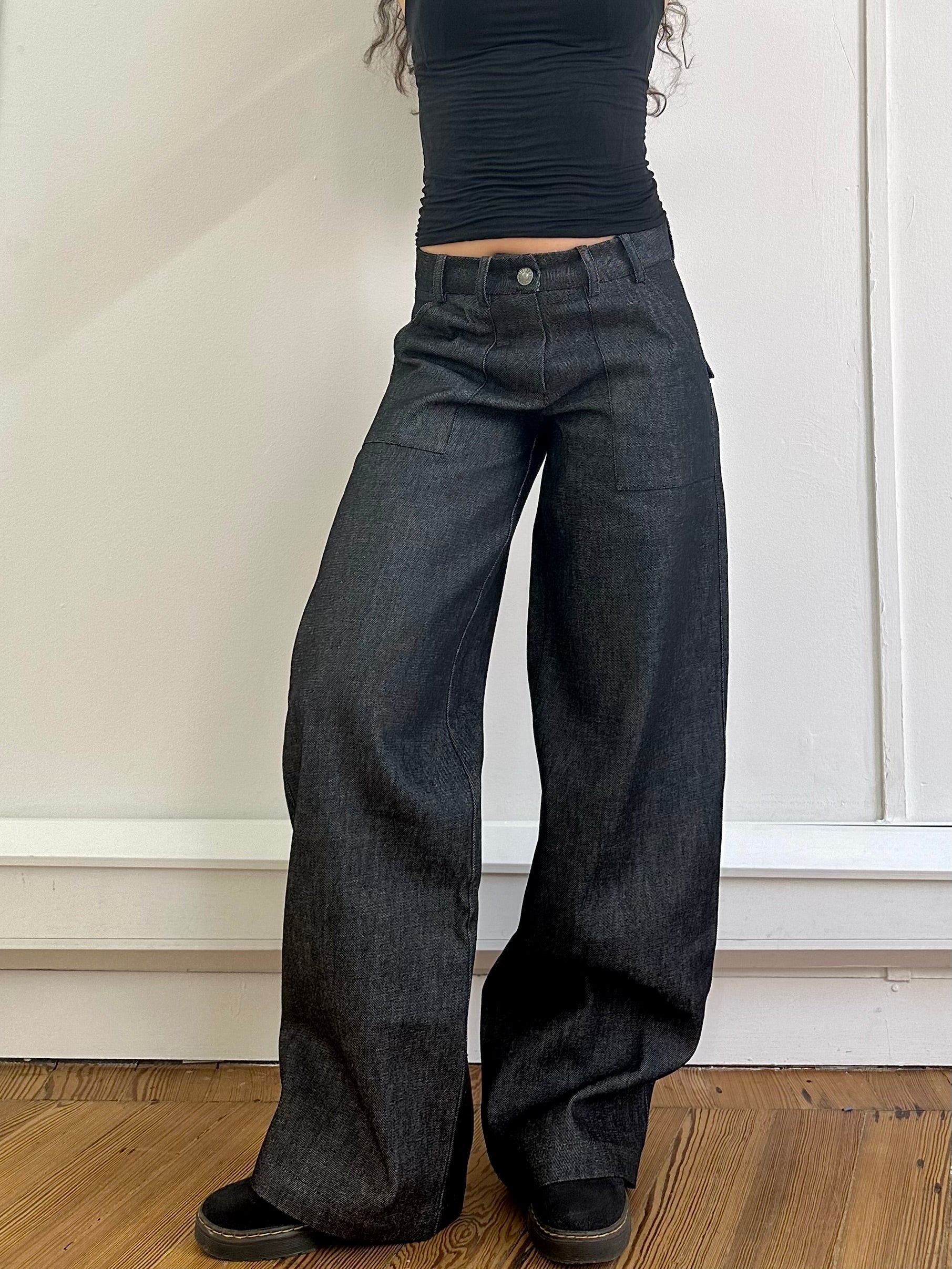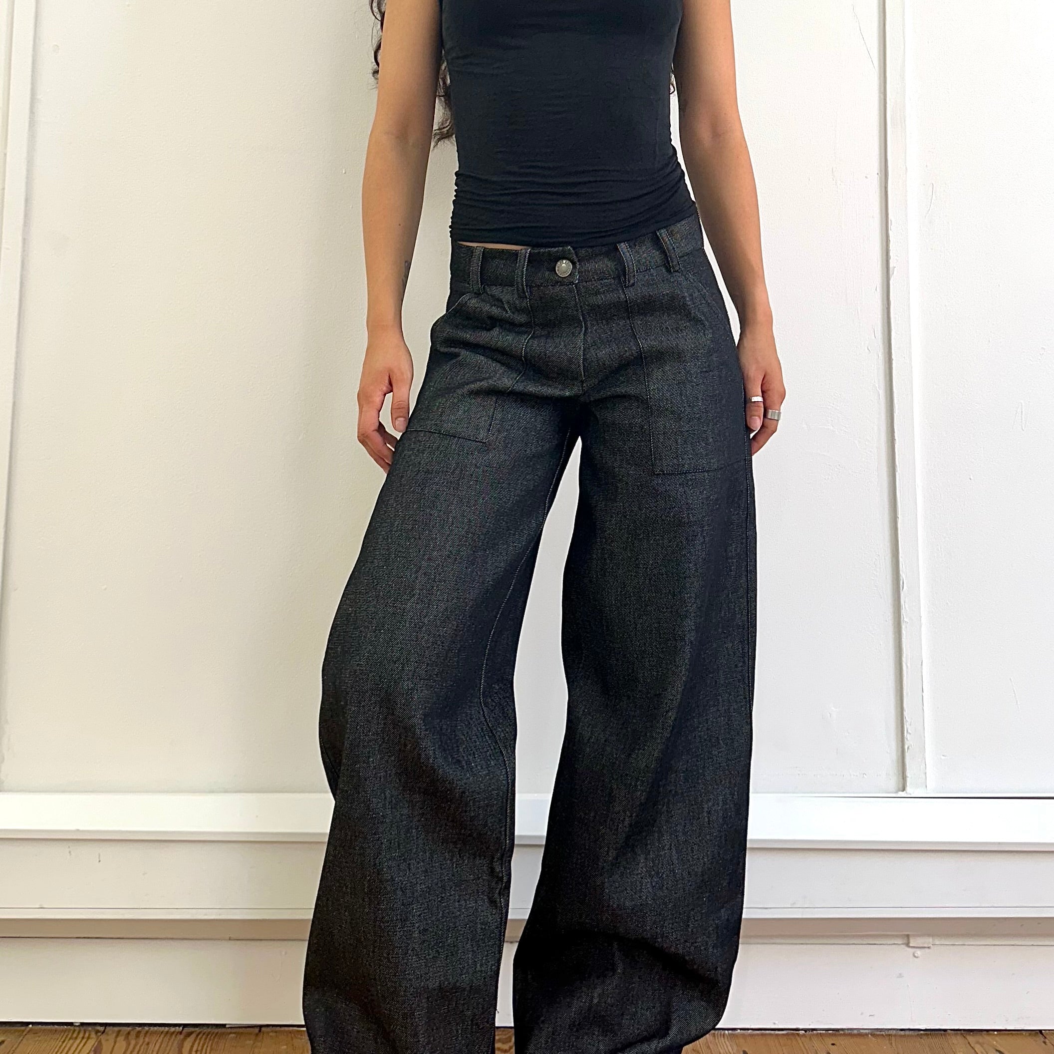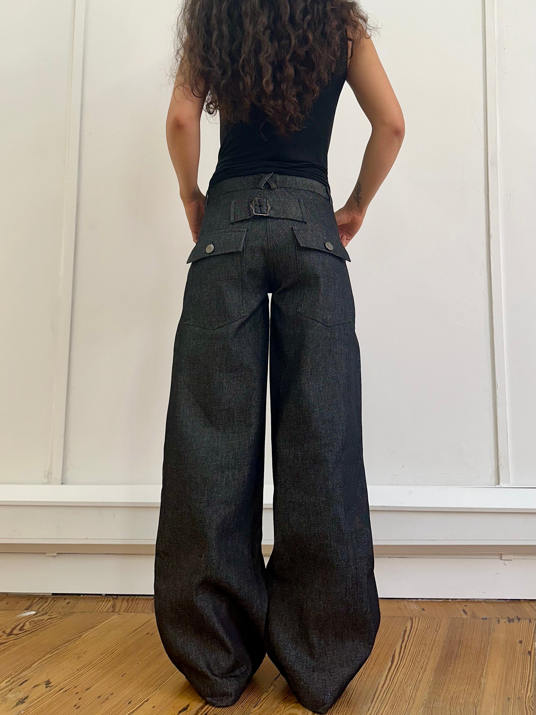 A wide leg, dark grey denim jean. Made from raw denim. Features an adjustable buckle back, front and back pockets and cross over belt loops. Inspired by 90's hip-hop fashion, a seamless blend between smart and casual.