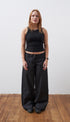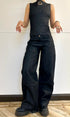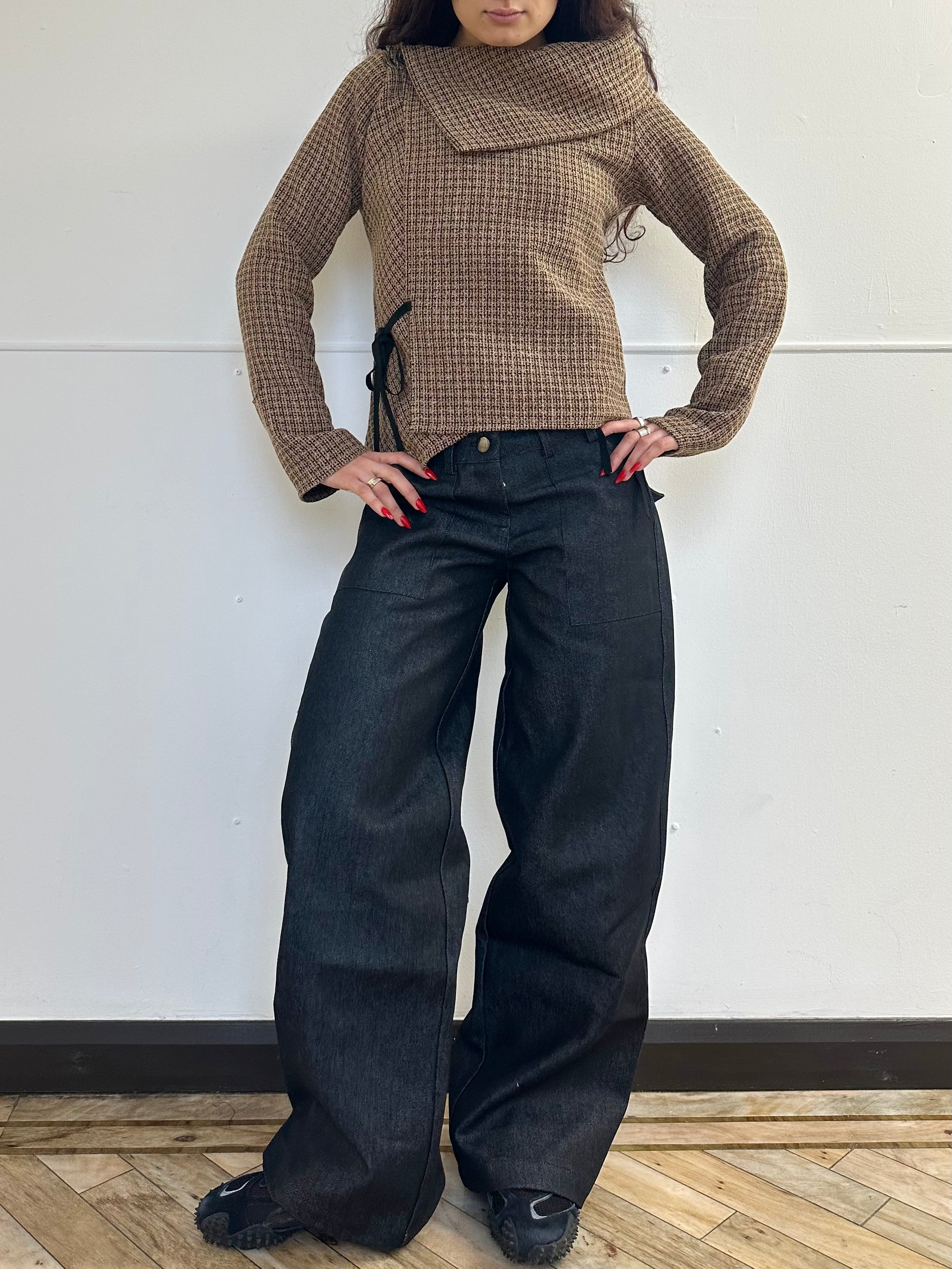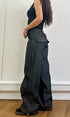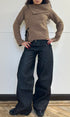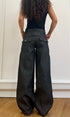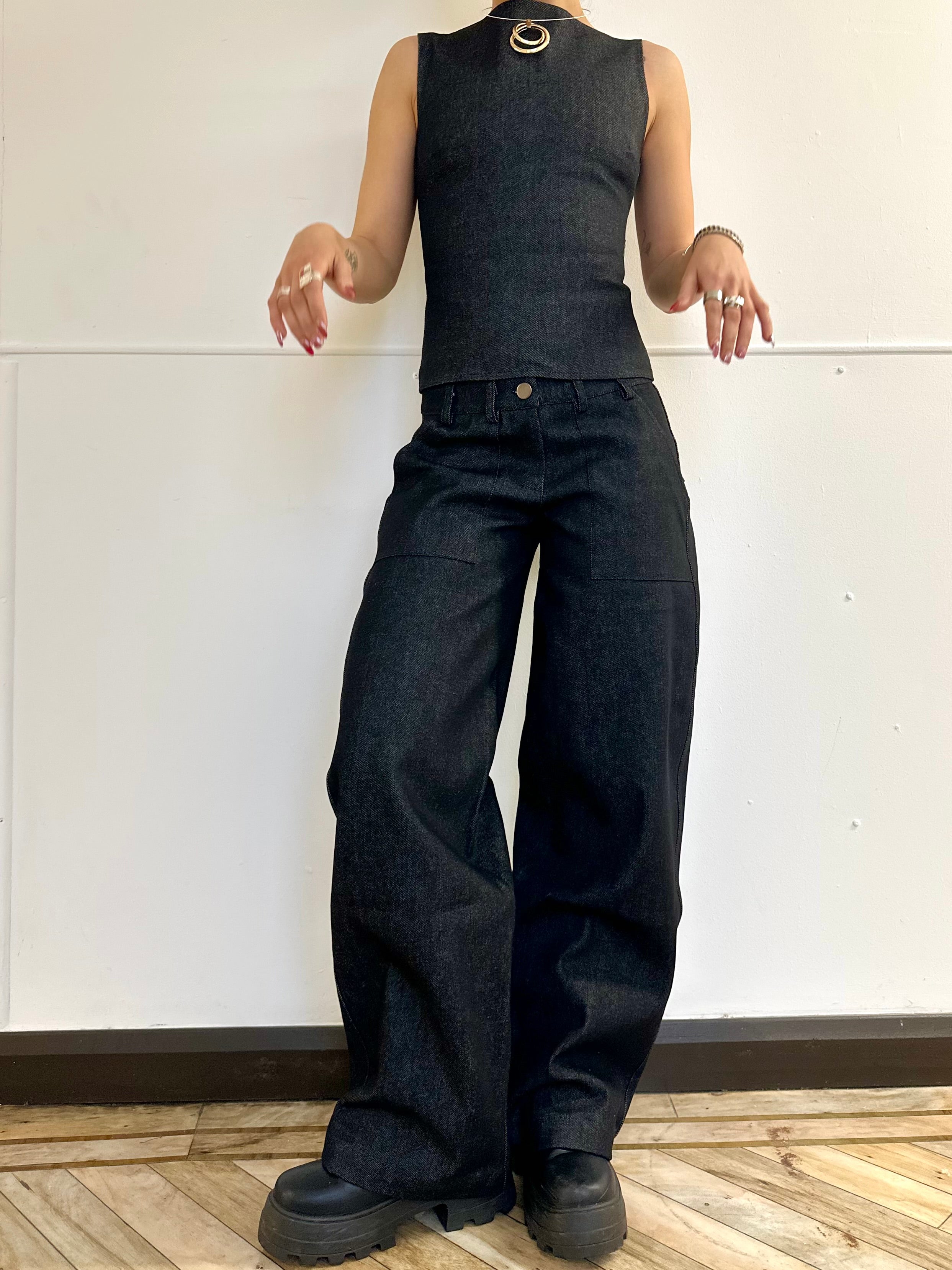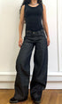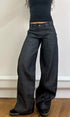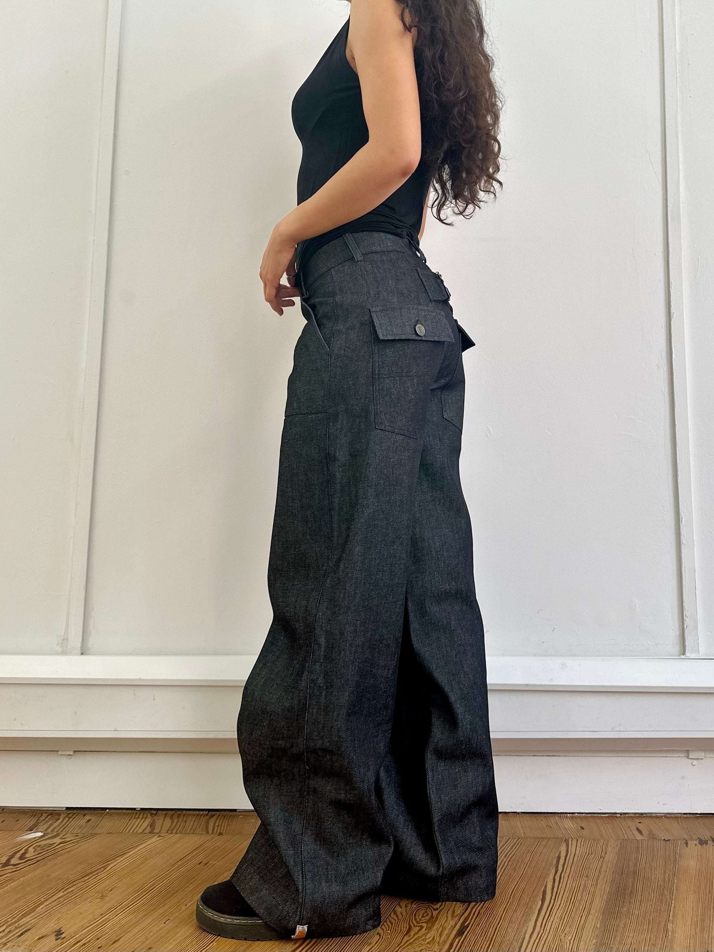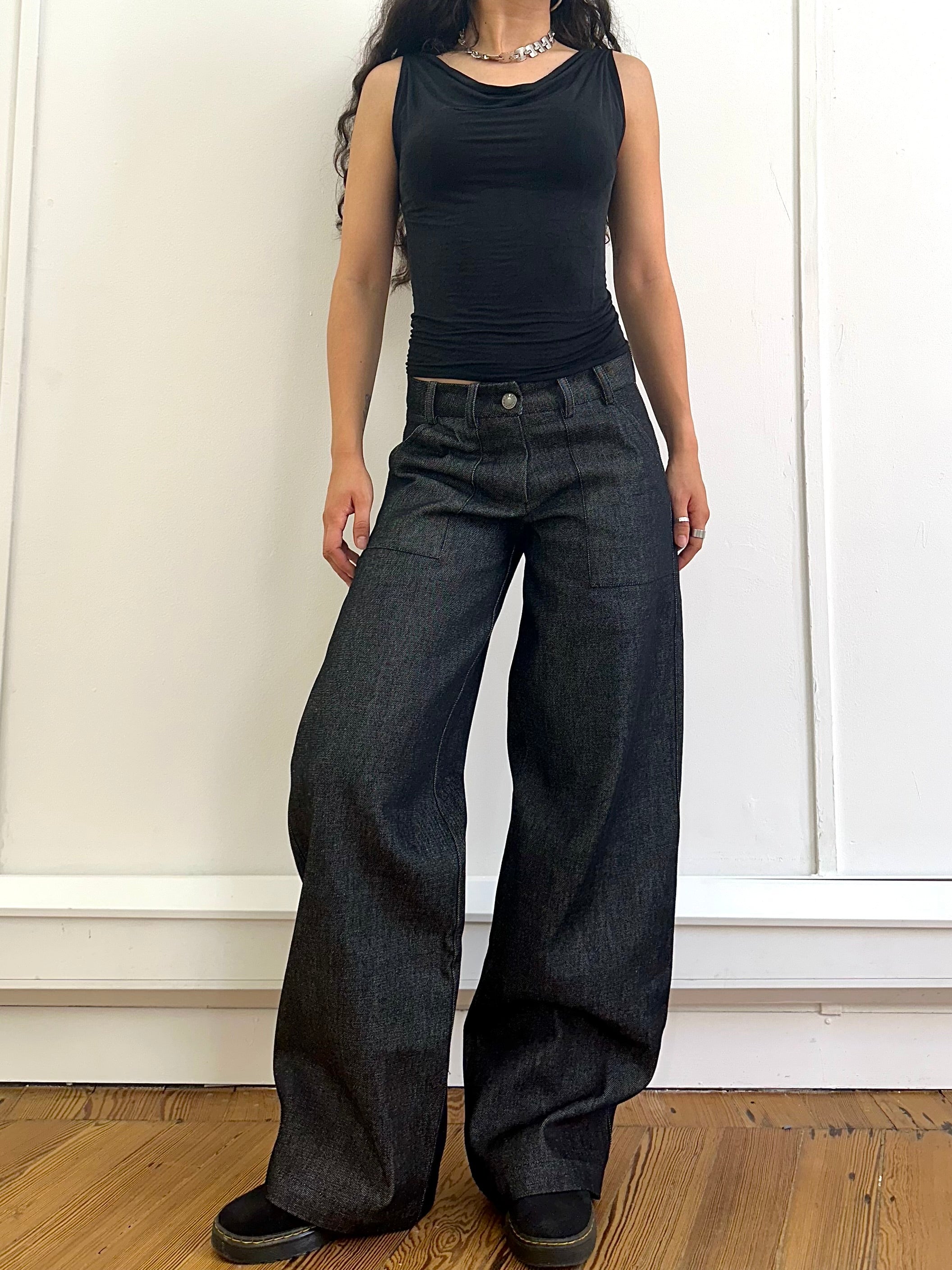 A wide leg, dark grey denim jean. Made from raw denim. Features an adjustable buckle back, front and back pockets and cross over belt loops. Inspired by 90's hip-hop fashion, a seamless blend between smart and casual.