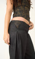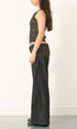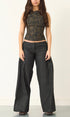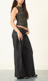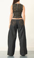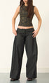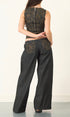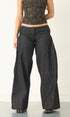 A low rise, super wide leg jean featuring a 'no waistband' waist and v-shaped side pleats to create a flattering fit. Crafted from a deadstock charcoal coloured raw denim with our classic contrast gold embroidery and finished with an embroidered K&R logo.