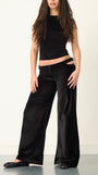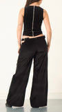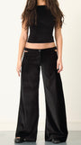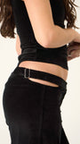 A luxurious, black velvet, wide leg trouser made from 100% heavyweight cotton, featuring an off-centre pleat and cut out waistband with adjustable buckle fastenings. The perfect party trouser for the festive season. Pairs perfectly with our matching Charlie top.